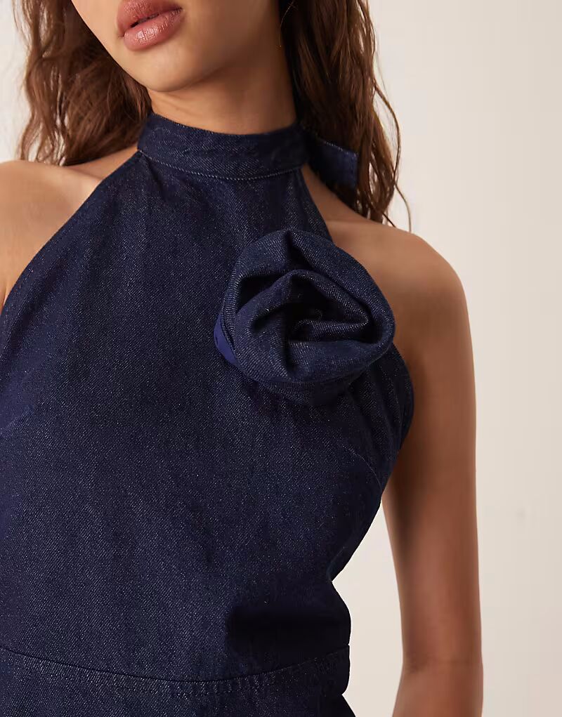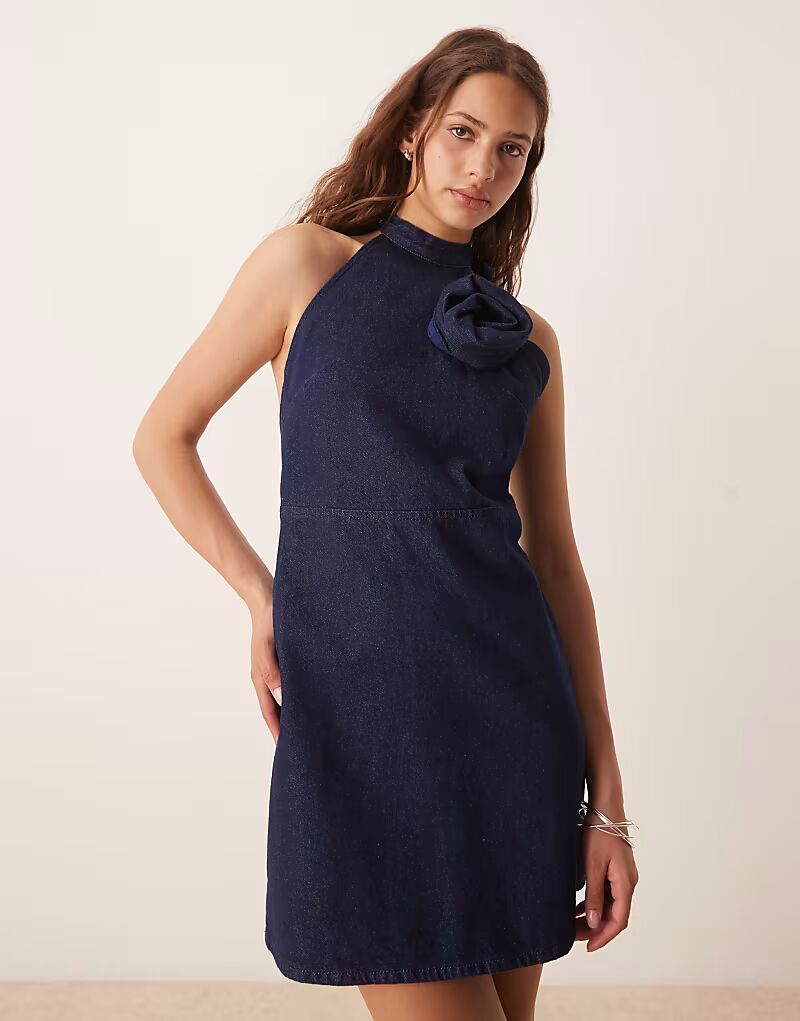 Джинсовое мини-платье ASOS DESIGN с вырезом халтер и розовым корсажем