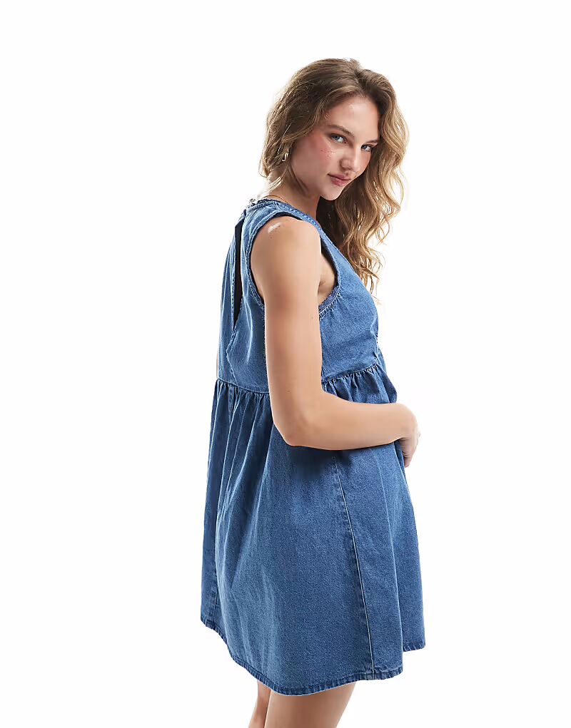 Джинсовое мини-платье ASOS DESIGN с вязаной крючком вставкой в ​​цвете «полустистая»