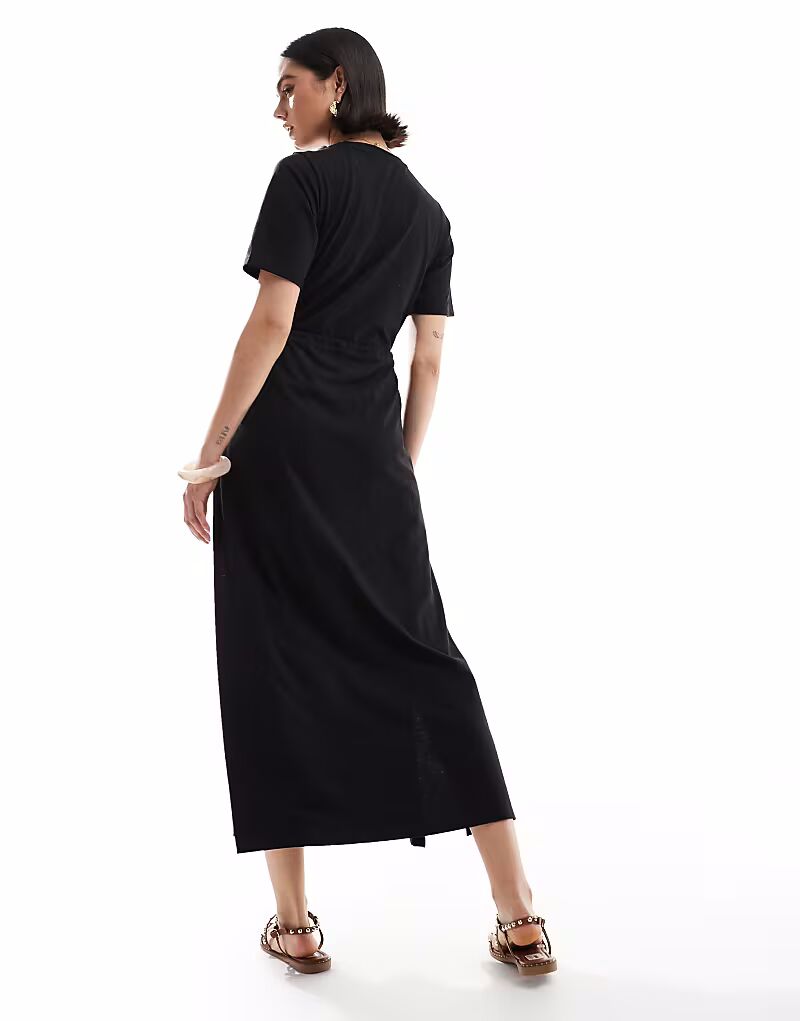 Потертое платье-халат миди с короткими рукавами черного цвета Threadbare