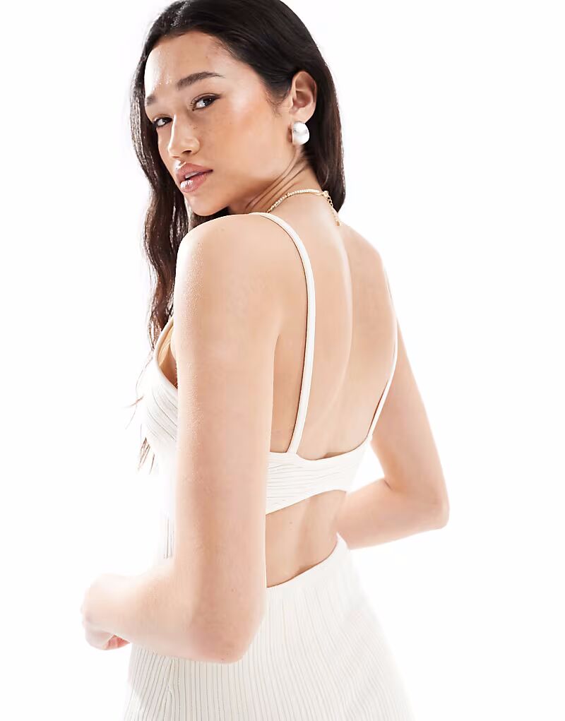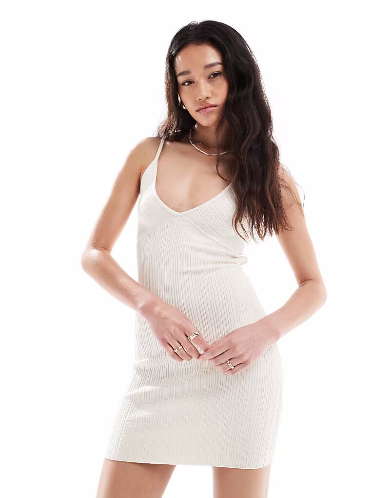 Трикотажное мини-платье Bershka цвета экрю с бретельками