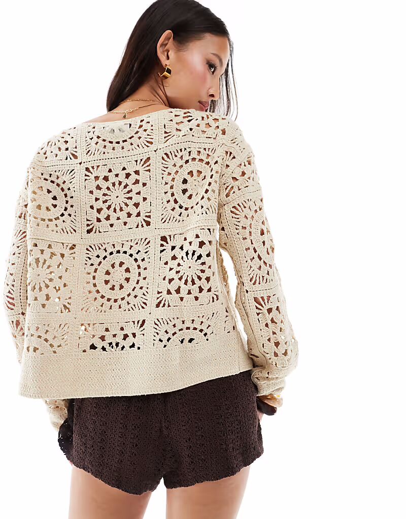 Вязание крючком: трикотажное, открытое, фактурное полотно с узором, напоминающим ручную работу.