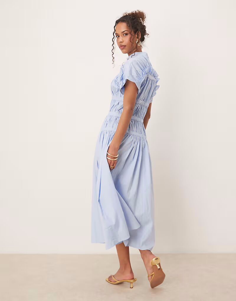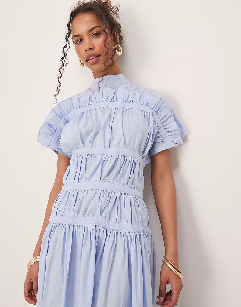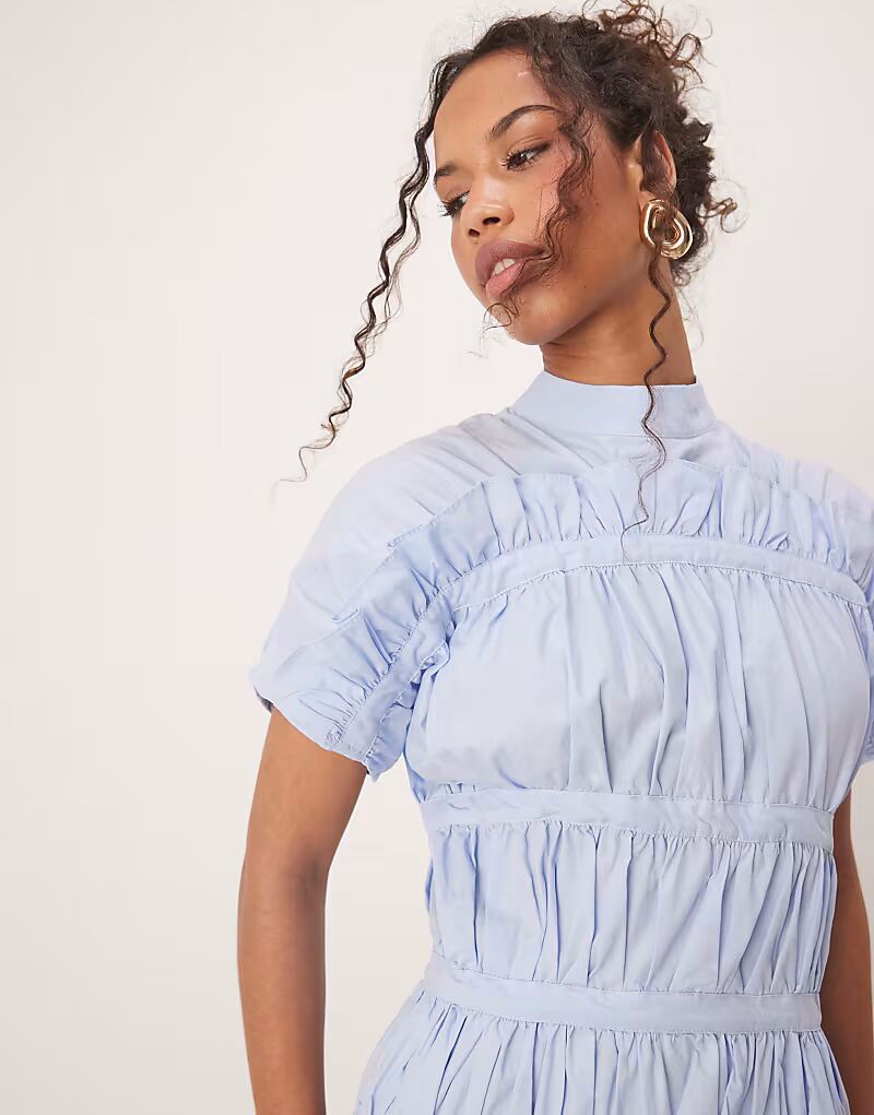 Платье миди Ghospell с высоким воротом и сборками синего цвета