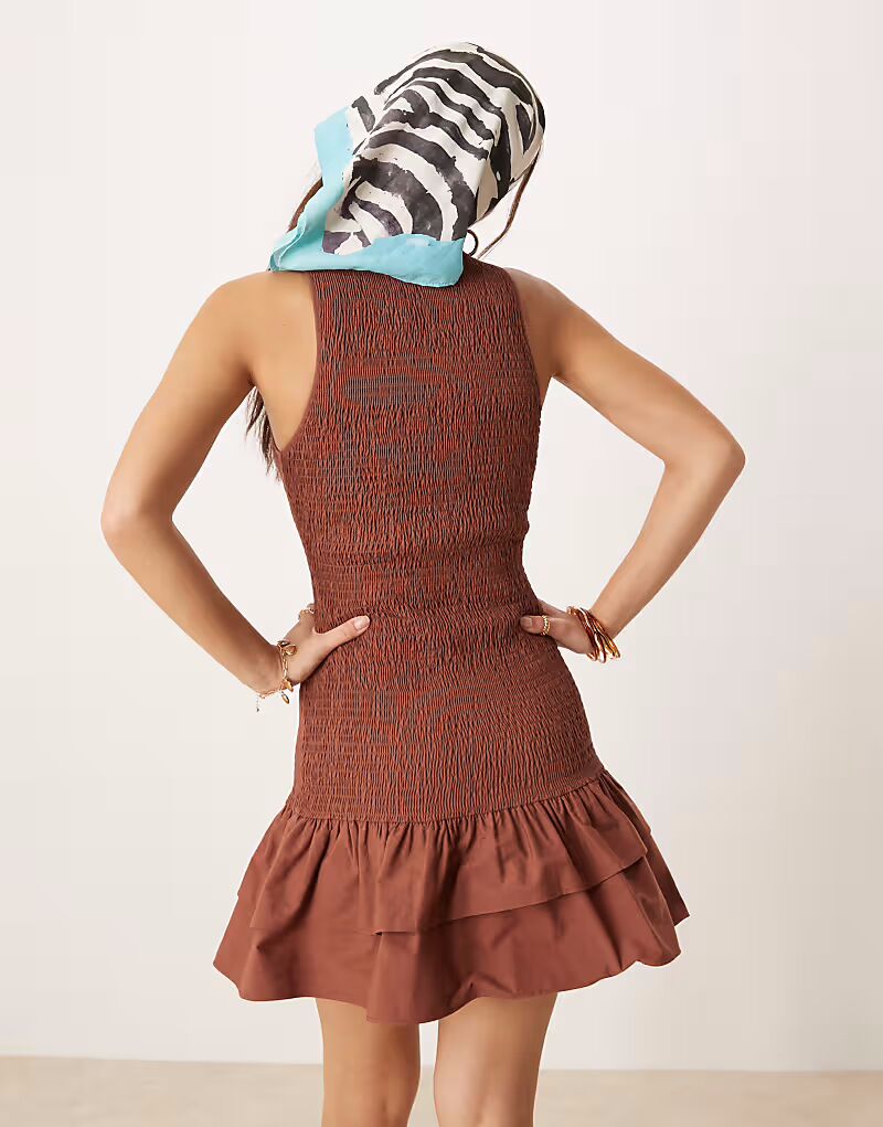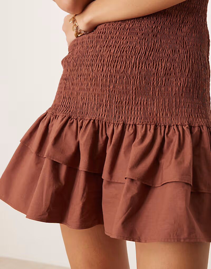 Мини-платье ASOS DESIGN в шоколадном цвете с оборками и сборками на подоле
