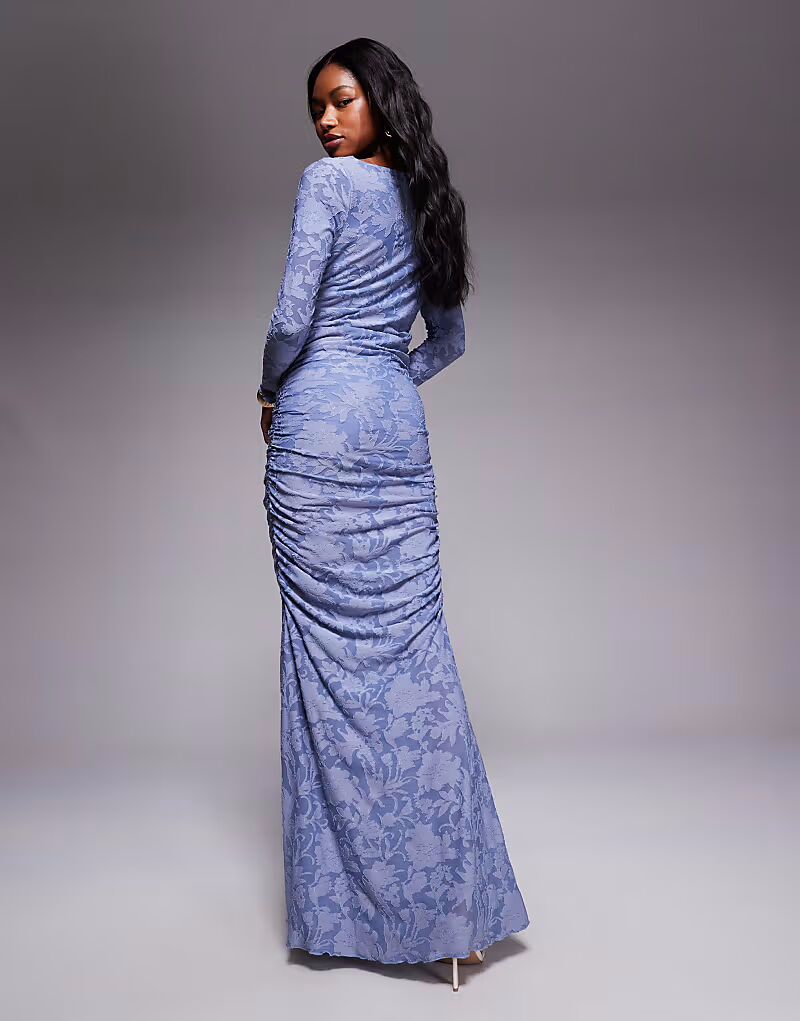 Длинное платье макси с длинными рукавами и сборками ASOS DESIGN devore синего цвета