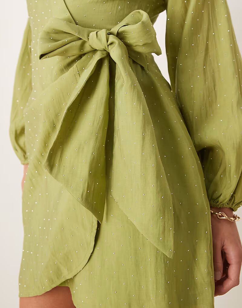 Мини-платье-халат Never Fully Dressed с эффектом горячего фикса в оливковом цвете 12 217₽