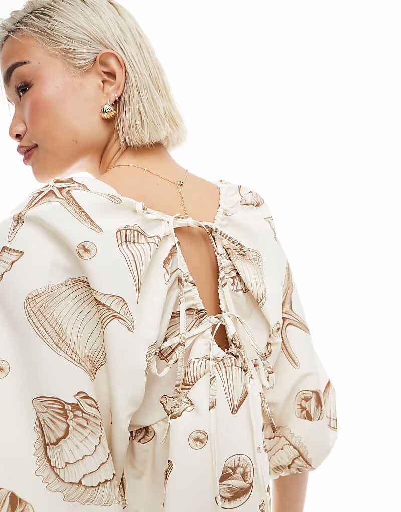 Мини-платье Vero Moda с рукавами-блузонами и нейтральным принтом ракушек