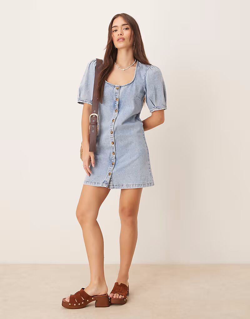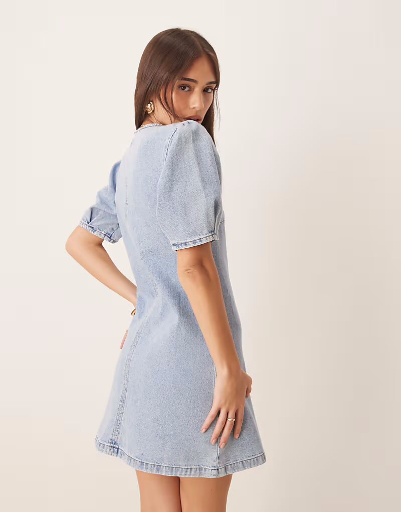 Джинсовое мини-платье ASOS DESIGN на пуговицах с рукавами-фонариками в бледном цвете