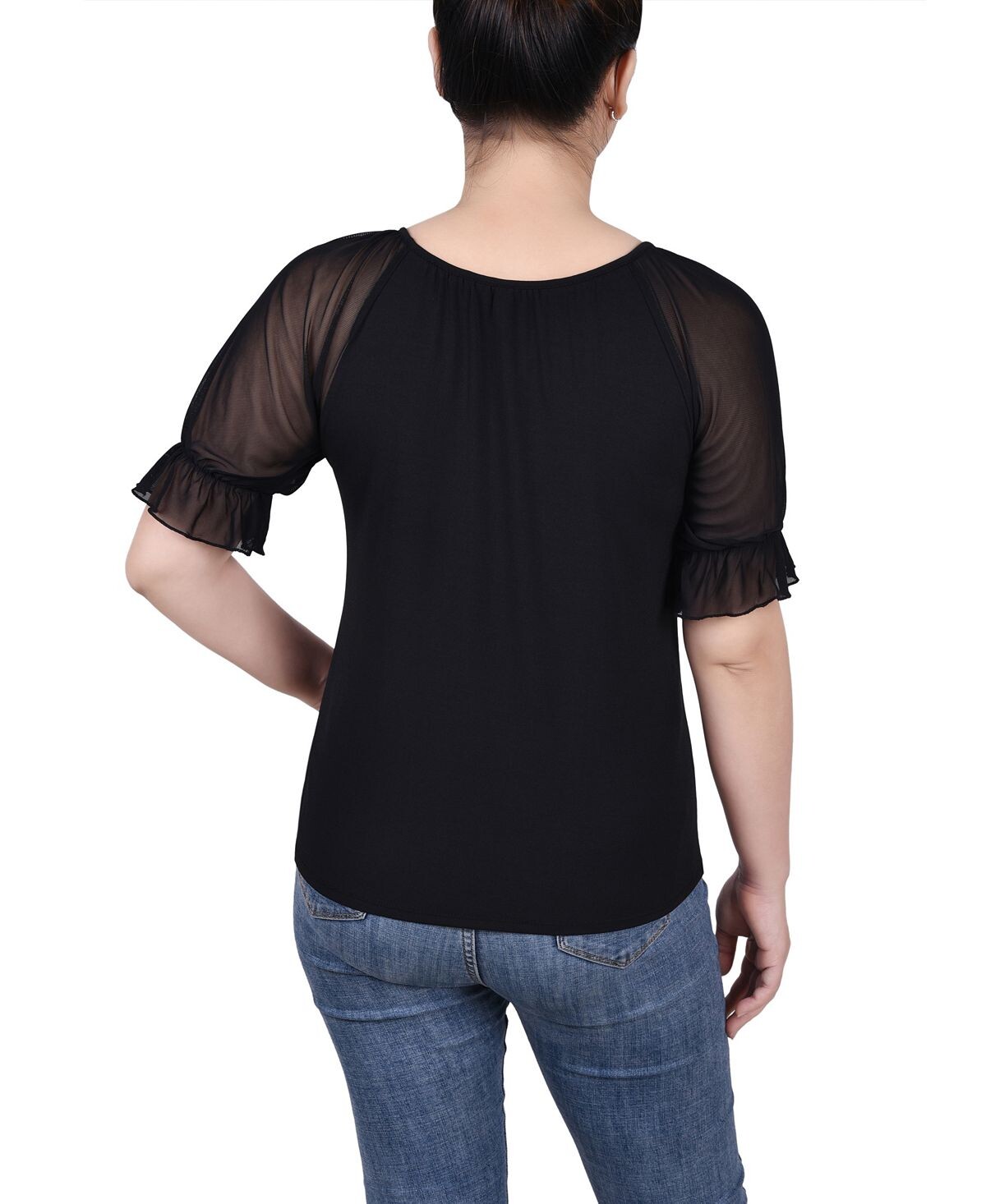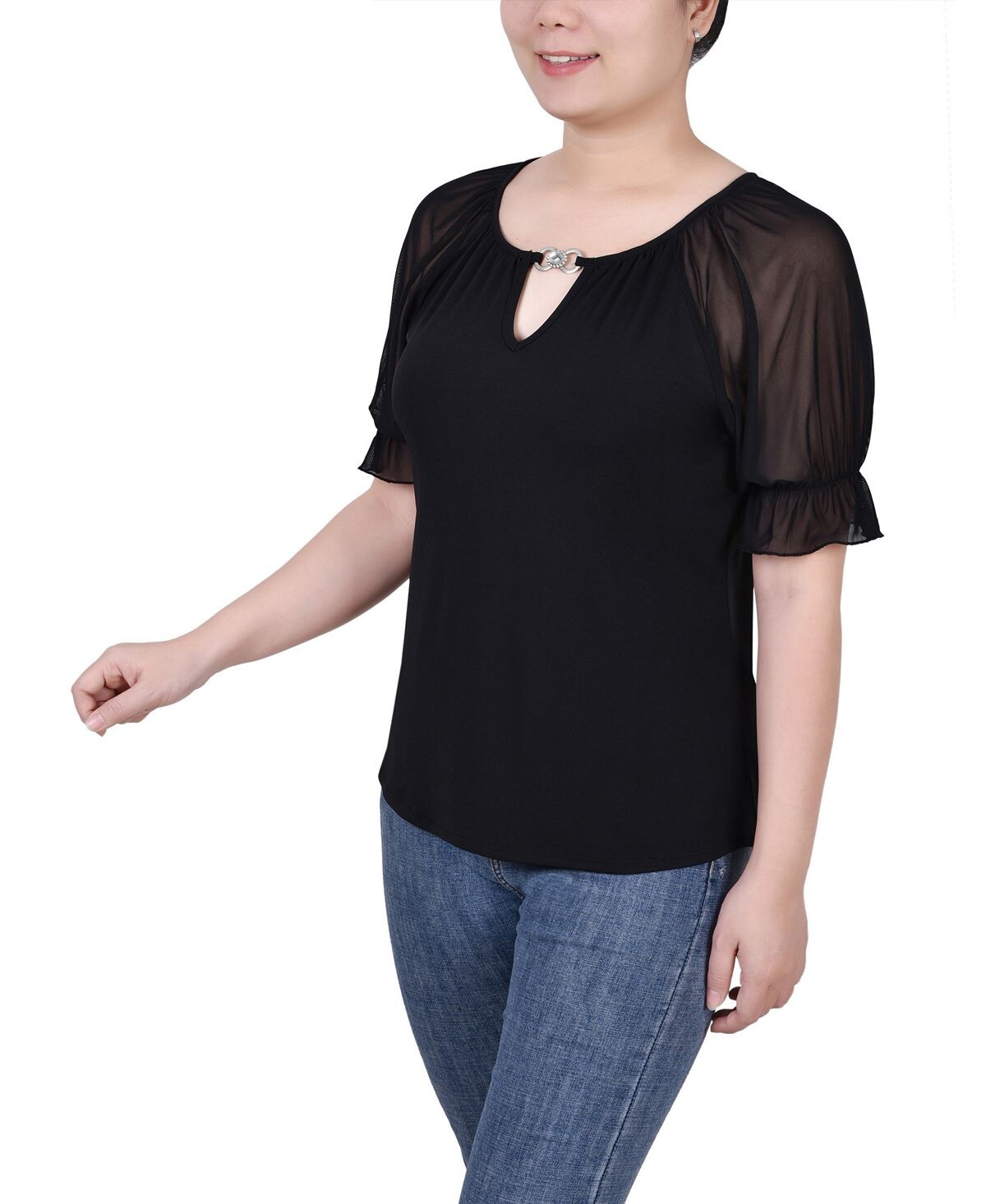 Простой, но элегантный топ NY Collection с сетчатыми рукавами и трикотажным боди. Нежная фурнитура подчеркивает вырез.
