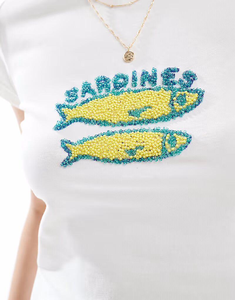 Футболка Miss Selfridge с рисунком сардины и бисером, белая