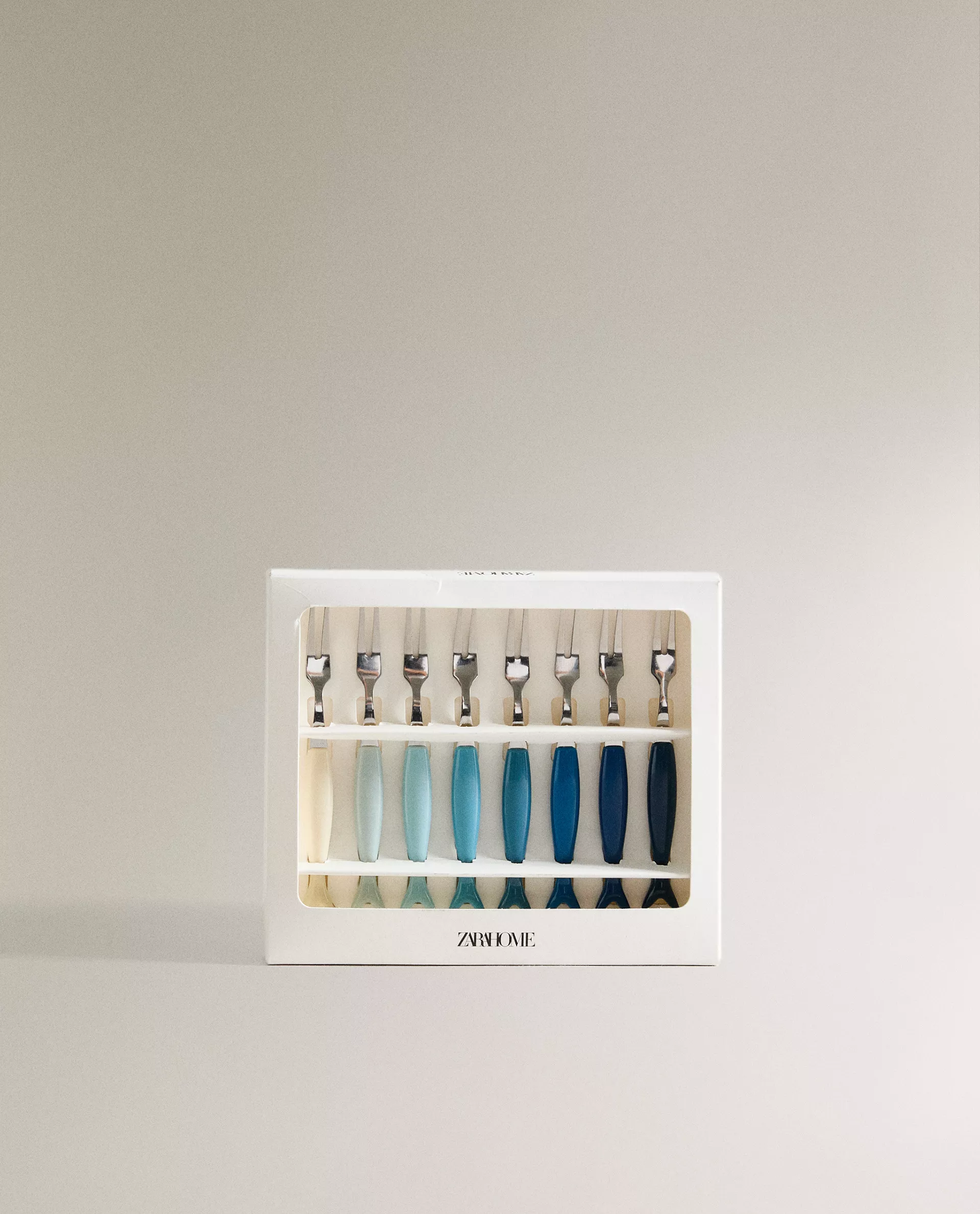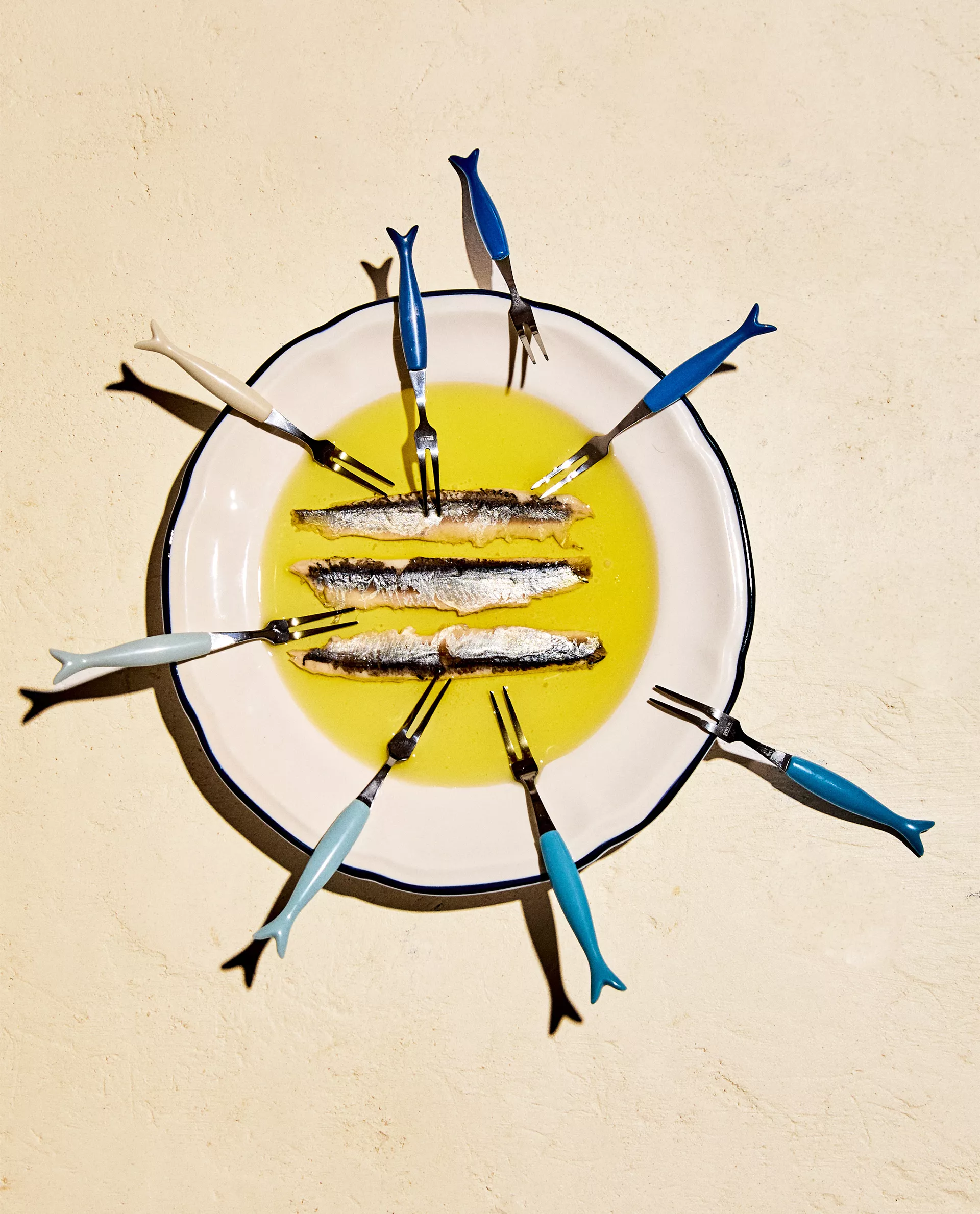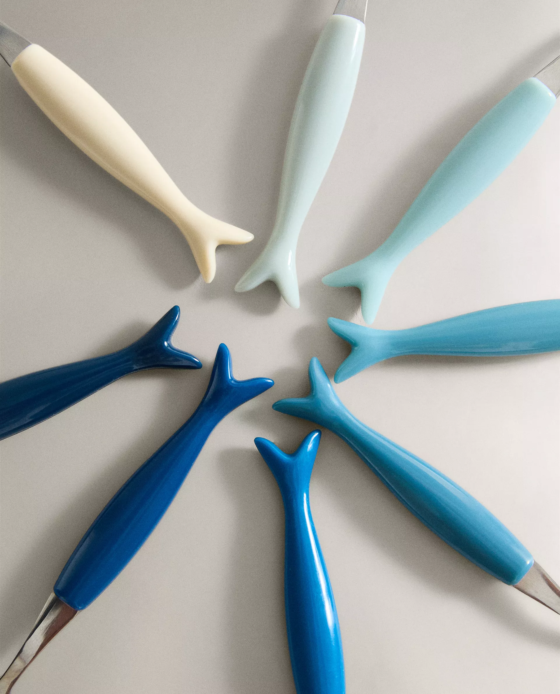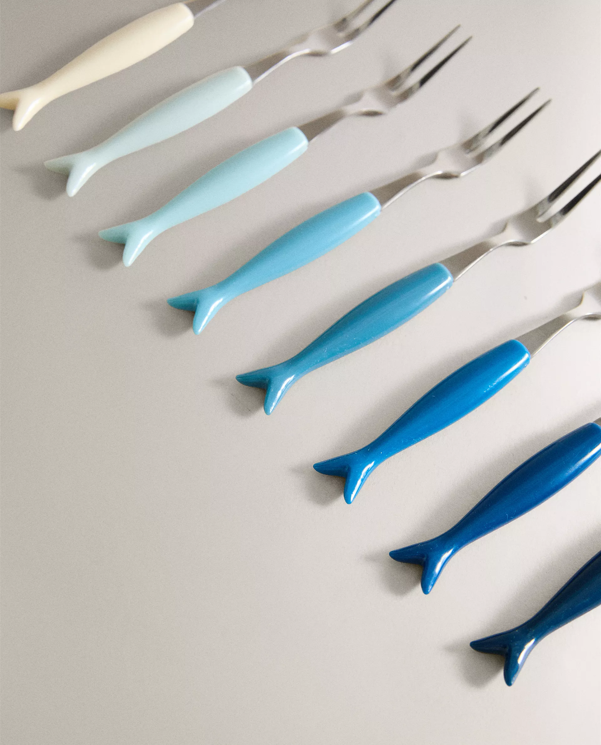 Вилка для аперитива из нержавеющей стали с ручкой из смолы в форме рыбьего хвоста.