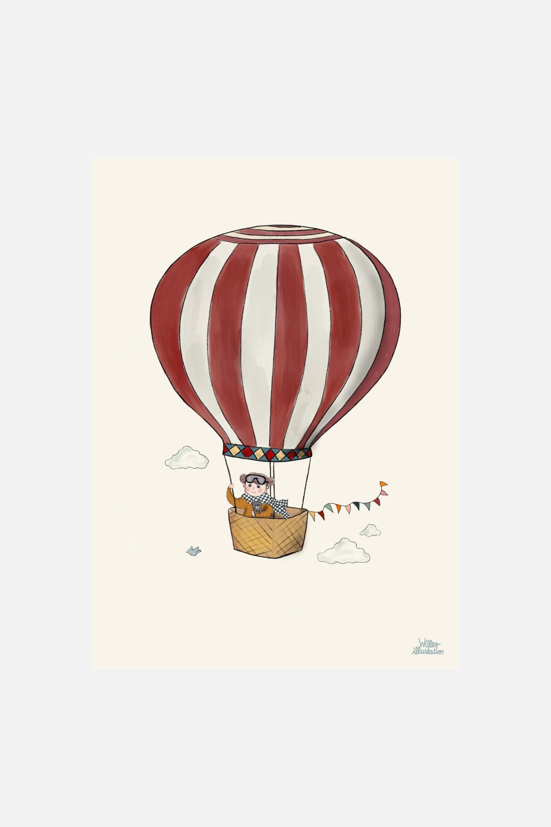 **Рамка не входит в комплект.** Добавьте немного причудливости в пространство вашего ребенка с помощью постера с иллюстрациями Willero. Это очаровательное произведение искусства с изображением воздушного шара создает сказочную атмосферу, что делает его идеальным дополнением для детских комнат, игровых комнат или спален. Благодаря мягким пастельным тонам и тонким деталям оно вдохновляет воображение и чувство приключения. Если вы ищете очаровательный декоративный настенный элемент, этот прекрасный художественный принт принесет тепло и чудо в любое пространство. Идеально подходит для маленьких исследователей, которые любят волшебство парения между облаками!