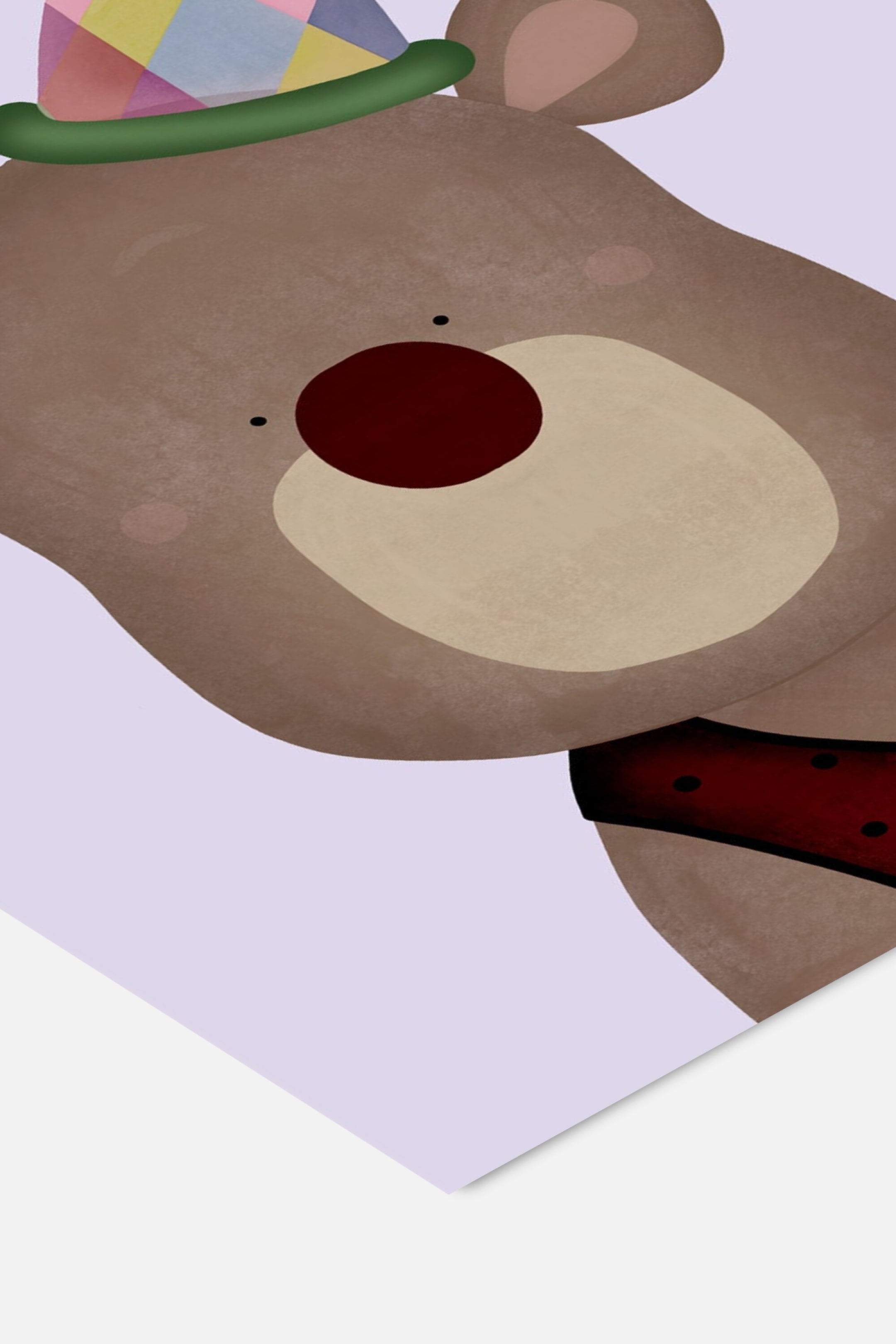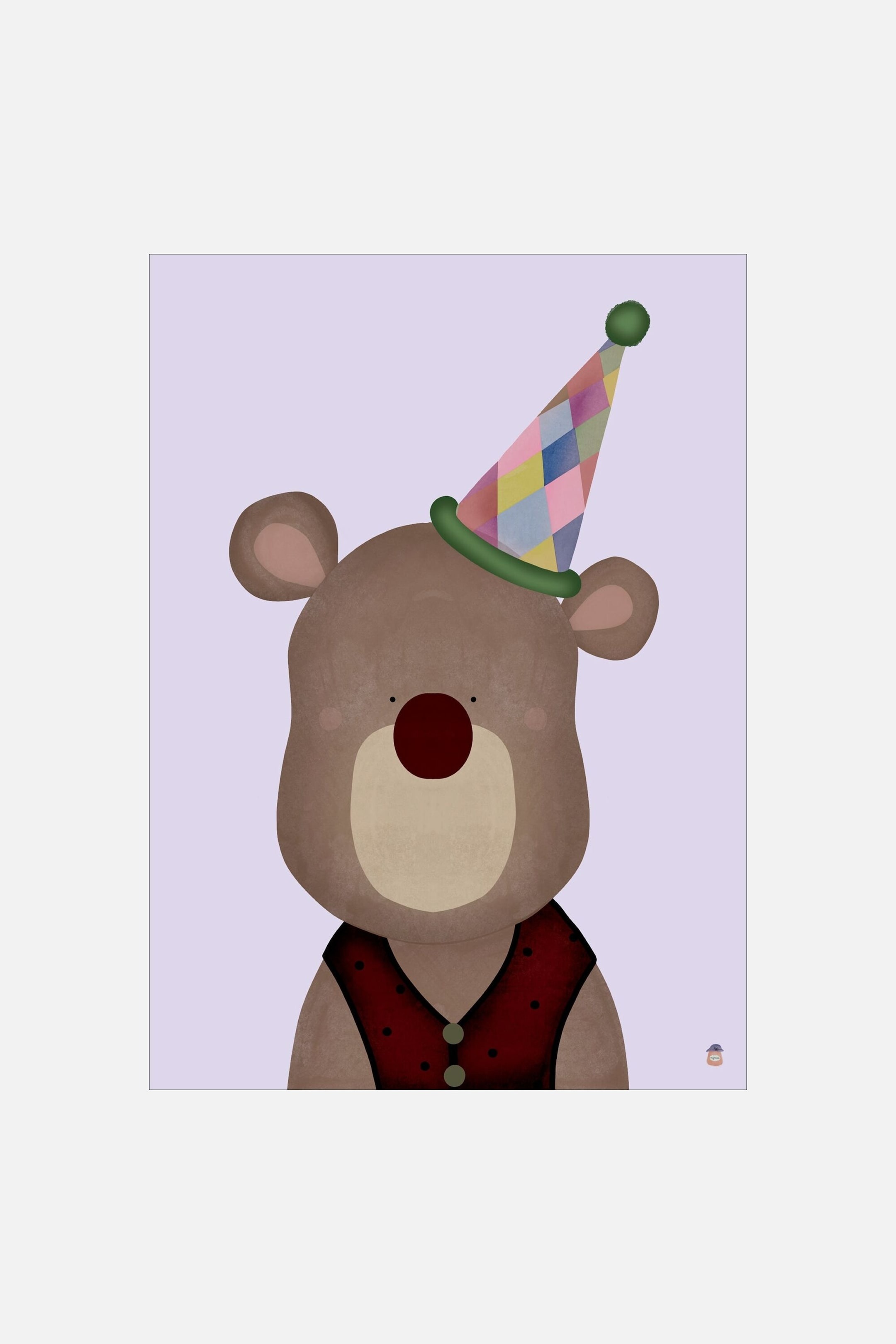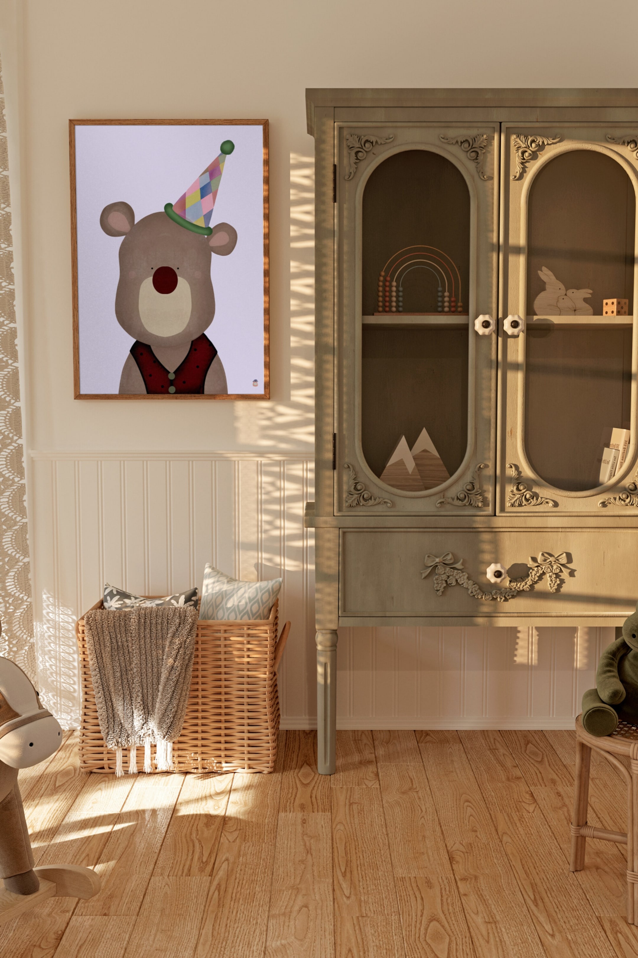 **Рамка не входит в комплект.** На этом очаровательном постере изображен очаровательный плюшевый мишка в праздничном наряде, в комплекте с жилетом в винтажном стиле и красочной шляпой с рисунком арлекина. Благодаря мягким пастельным тонам и минималистскому дизайну это произведение искусства излучает тепло и радость, что делает его идеальным декоративным элементом для детских комнат, детских комнат или коллекций произведений искусства, полных причуд. Милое выражение и ностальгическая эстетика добавят очаровательный штрих любому пространству, идеально подходят для тех, кто любит уютные иллюстрации, вдохновленные книгами.