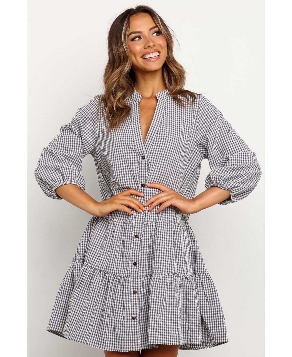 Это великолепное платье с принтом в мелкую клетку станет прекрасным дополнением вашего летнего гардероба! Длина выше колена и свободный крой делают его удобным, но стильным выбором. V-образный вырез придает этому платью женственность, а длинные рукава с эластичными манжетами добавляют элегантности.