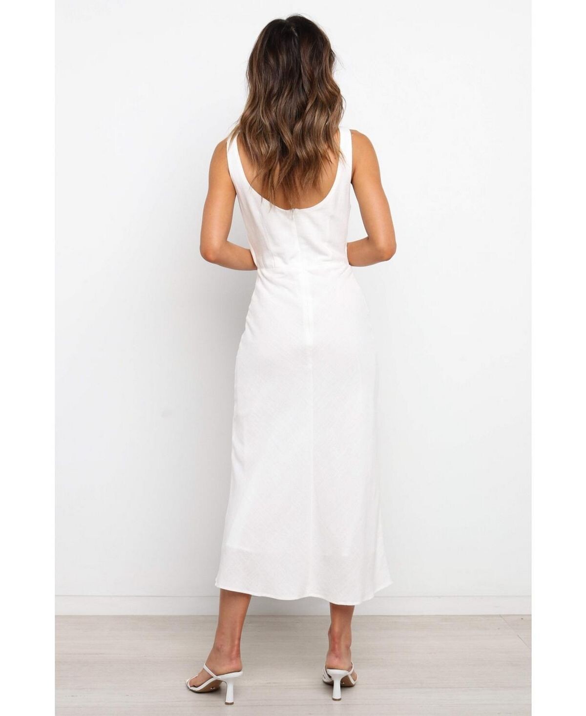 Поднимите свой стиль на новую высоту в этом шикарном платье длины миди! Привлекательный V-образный вырез создает неподвластный времени силуэт, а закрученная деталь на груди с вырезом придает нотку гламура. Для дополнительной безопасности платье дополнено застежкой на крючок и потайной молнией сзади.