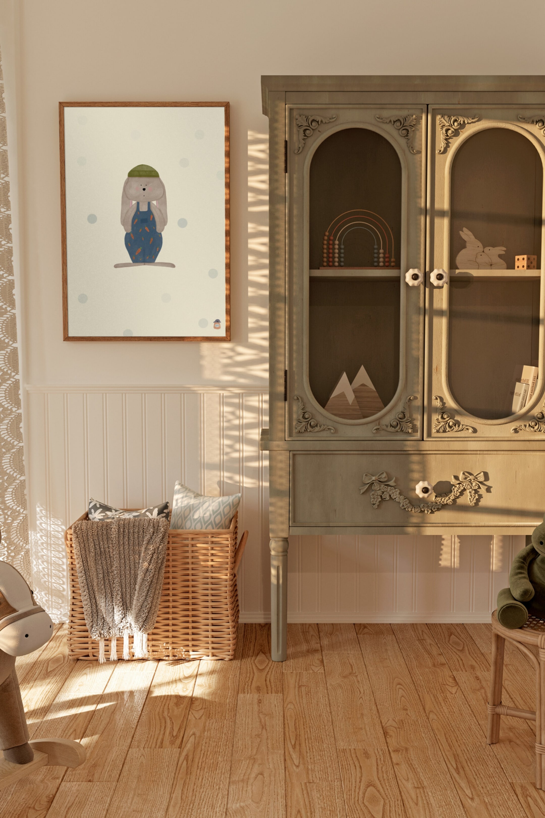 Плакат не имеет рамы. Этот трогательный постер изображает очаровательного кролика, одетого в синие комбинезоны, украшенные маленькими морковками, в паре с зеленой шляпой. С мягким пастельным фоном и нежным горошком эта минималистичная, но игривая работа идеально подходит для украшения детской комнаты, детской комнаты или для тех, кто любит причудливые узоры с животными. Ее мягкие оттенки и очаровательный дизайн добавят тепла и индивидуальности любому пространству.