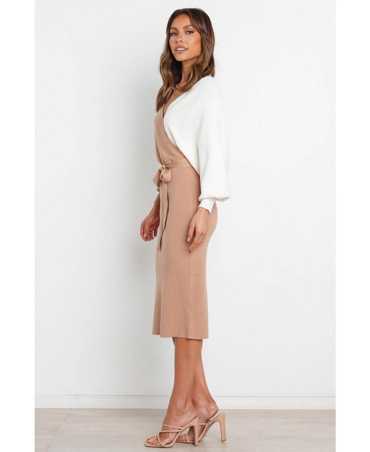 Это облегающее трикотажное платье – незаменимая вещь в гардеробе любой модницы! Длина миди и накладной V-образный вырез создают элегантный силуэт, который идеально подойдет для любого случая. Широкий длинный рукав с ребристой манжетой придает образу игривости, а двухцветный верх придает этому платью особый шарм.