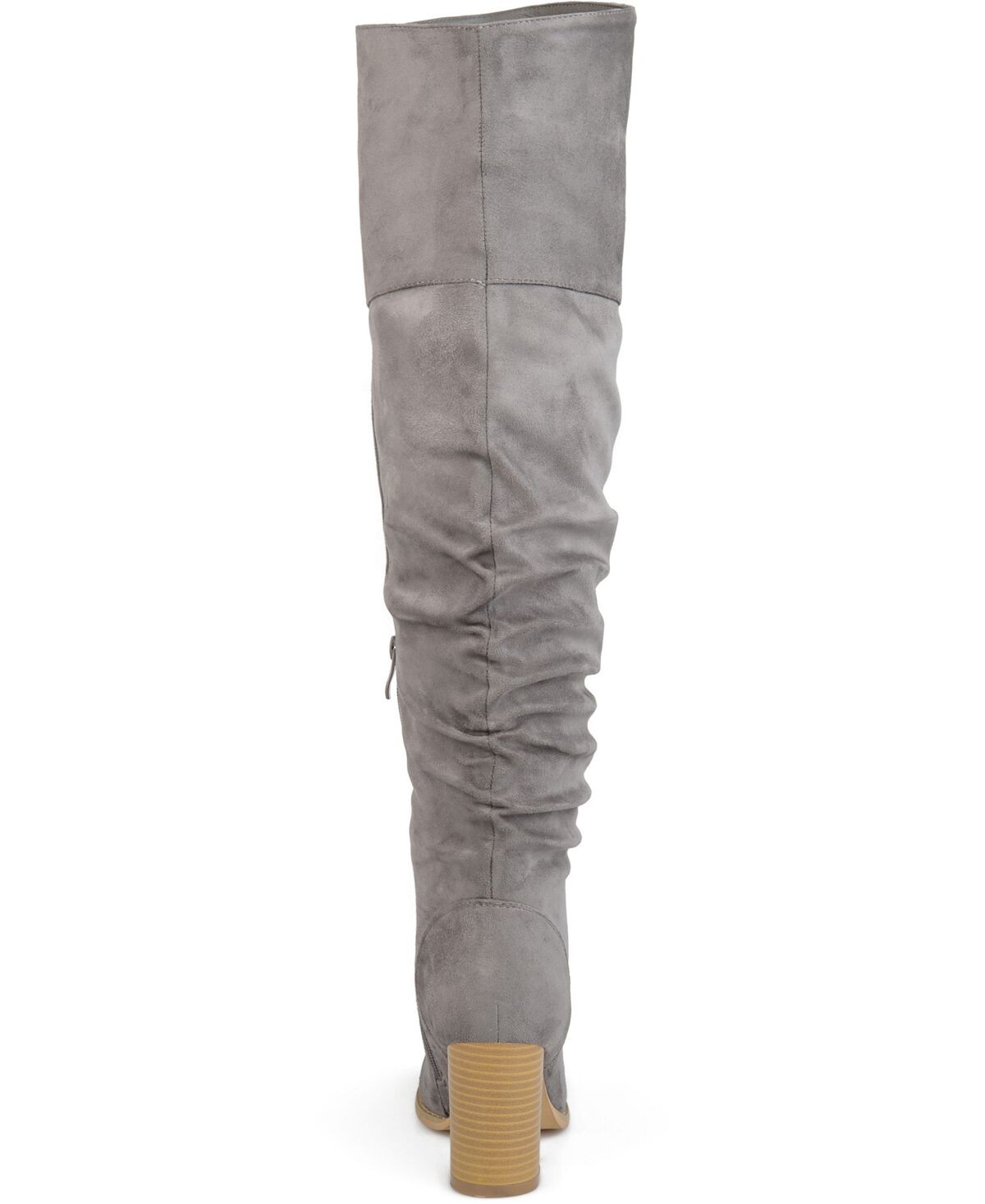 Сапоги выше колена со сборками от Journee Collection имеют верх из мягкой искусственной замши (полиэстера, полиуретана), возвышающийся над коленями, с рельефными союзками, создающими стильные детали. Закругленный носок и массивные высокие каблуки завершают образ.