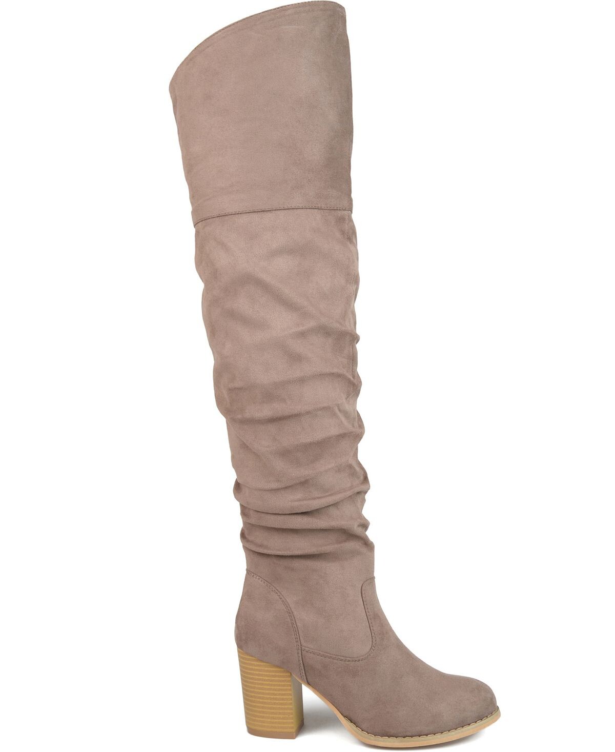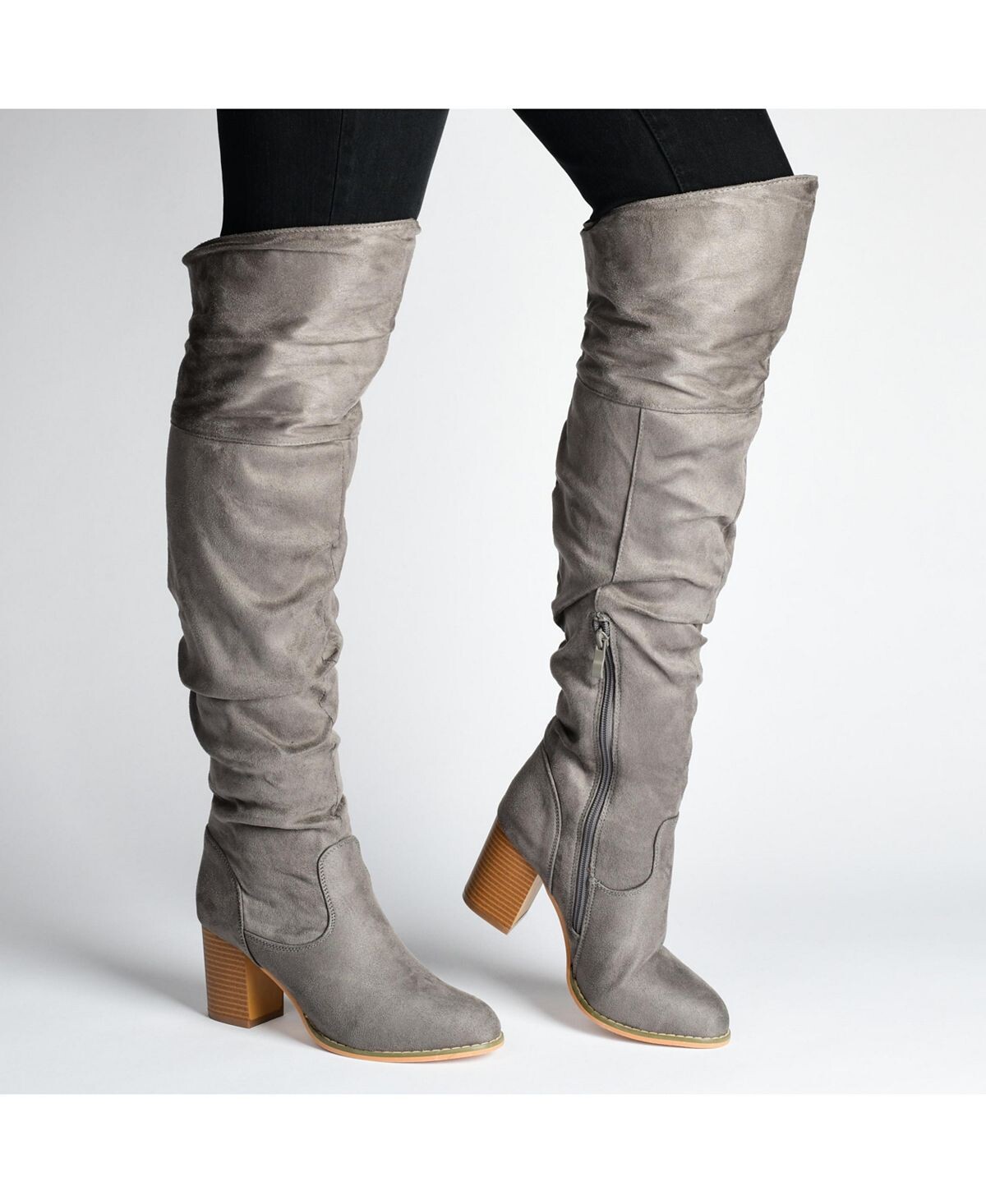 Сапоги выше колена со сборками от Journee Collection имеют верх из мягкой искусственной замши (полиэстера, полиуретана), возвышающийся над коленями, с рельефными союзками, создающими стильные детали. Закругленный носок и массивные высокие каблуки завершают образ.