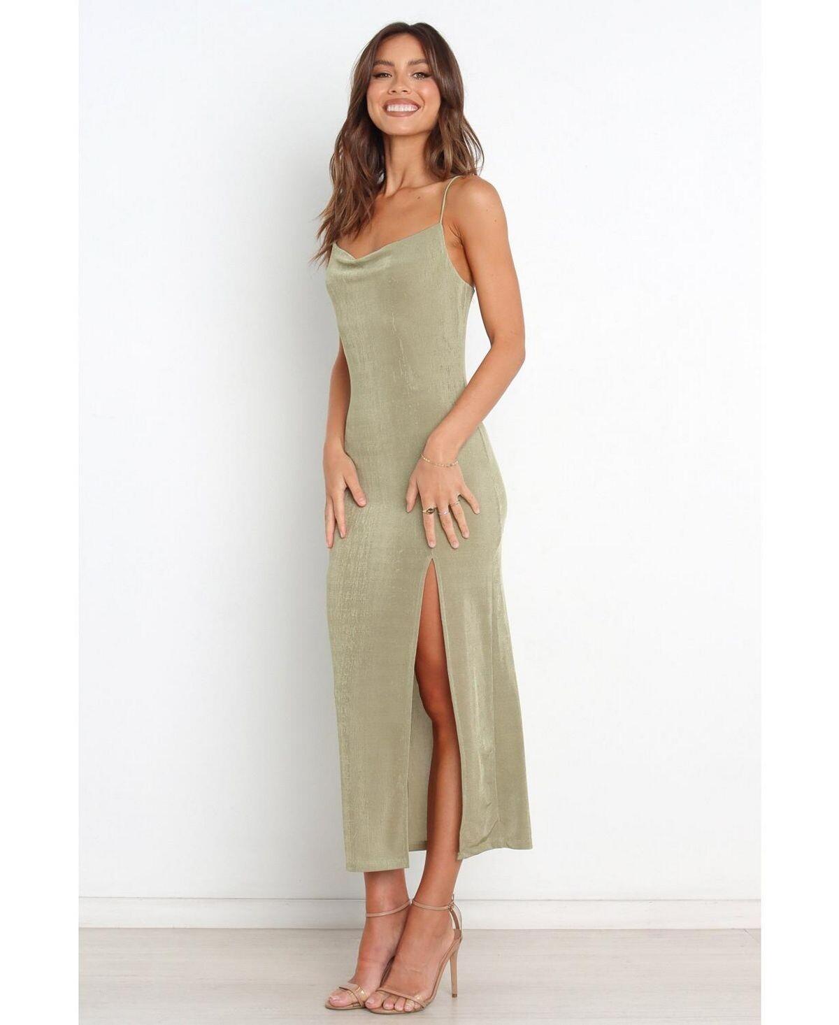 Если вы ищете идеальное вечернее платье, не ищите дальше! Наше облегающее платье миди-длины с воротником-хомутом, тонкими бретелями на бретельках и разрезом спереди — идеальный выбор. Сверкающий материал отделки придаст вашему стилю еще больше блеска в особенный вечер.