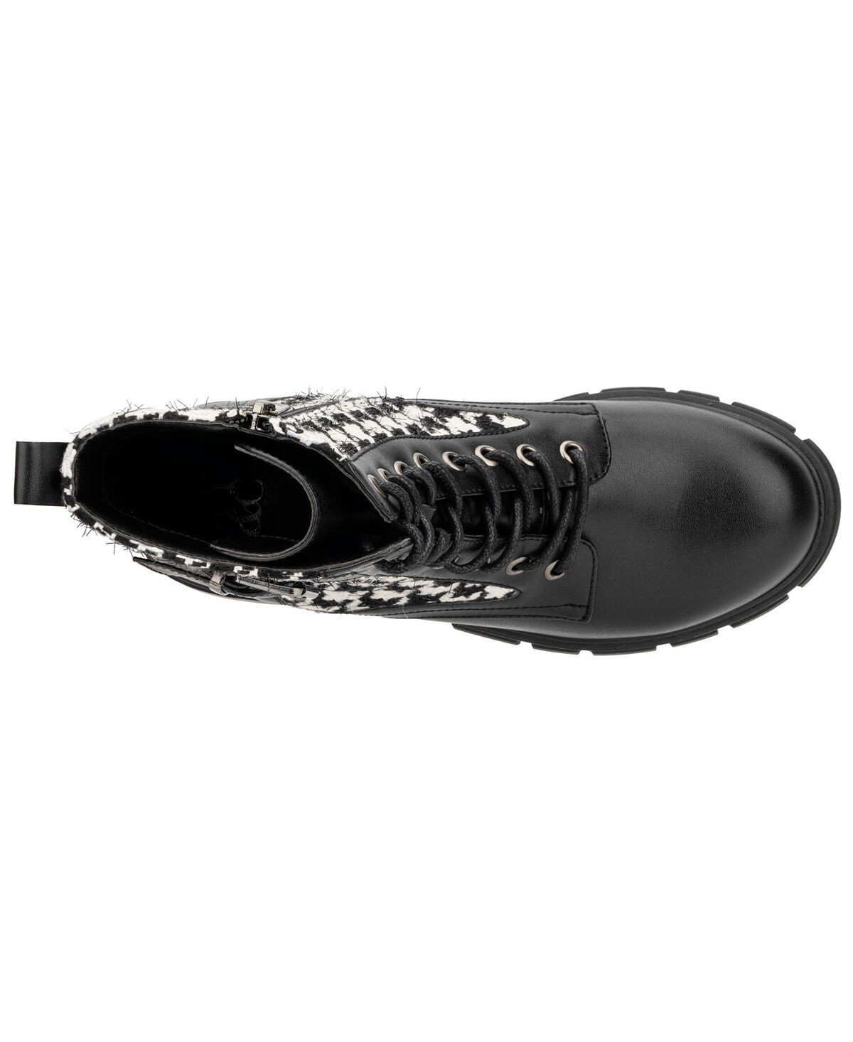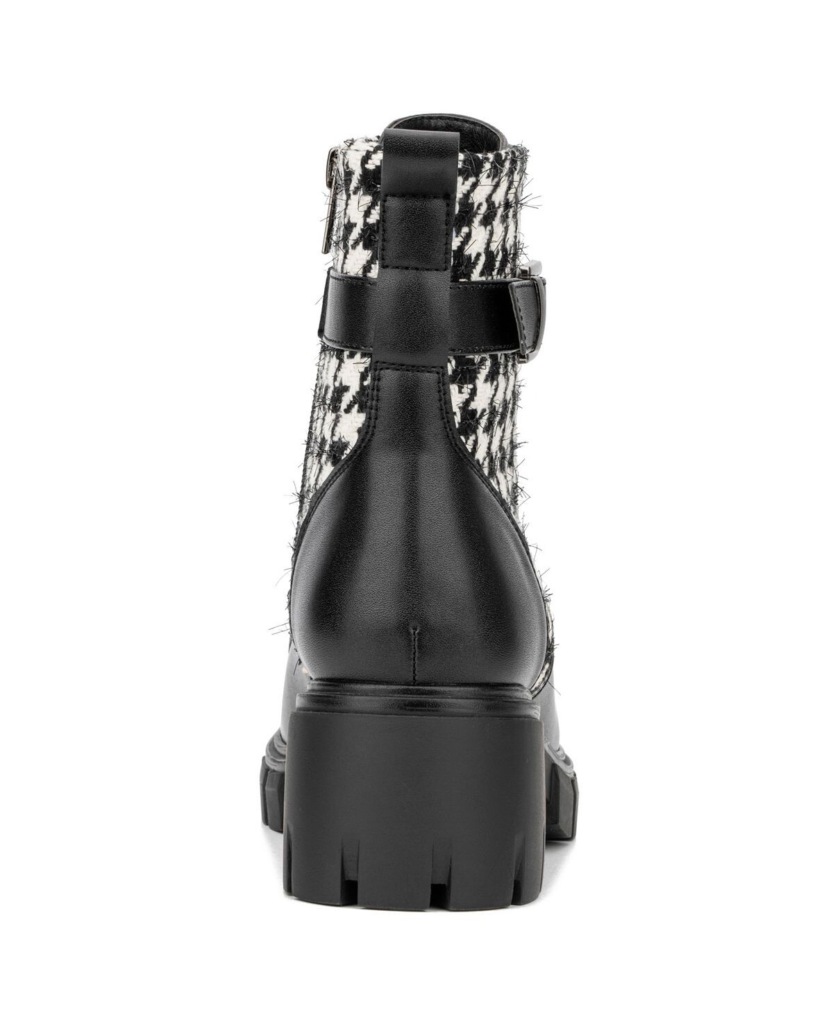 Двухцветные армейские ботинки Christina отличаются смелым и резким стилем. Эти ботильоны имеют верх с принтом «гусиные лапки», шнуровку и подошву с выступами.