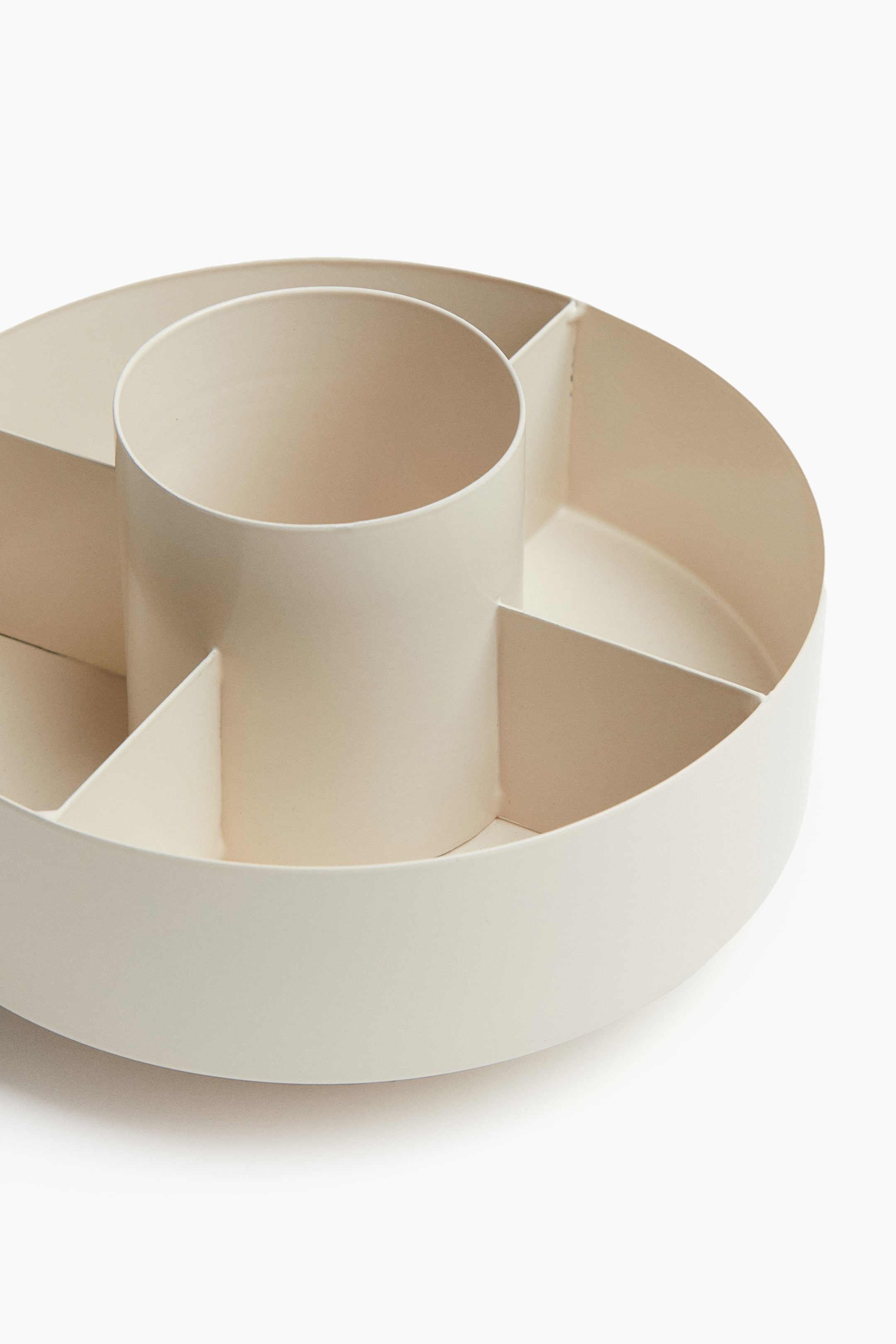 Круглый металлический контейнер с пятью отделениями. Идеально подходит для хранения косметики, канцелярских принадлежностей и других мелких предметов. Вращающаяся конструкция обеспечивает лёгкий доступ к хранящимся предметам, а силиконовое покрытие на дне защищает поверхность, на которой стоит контейнер.