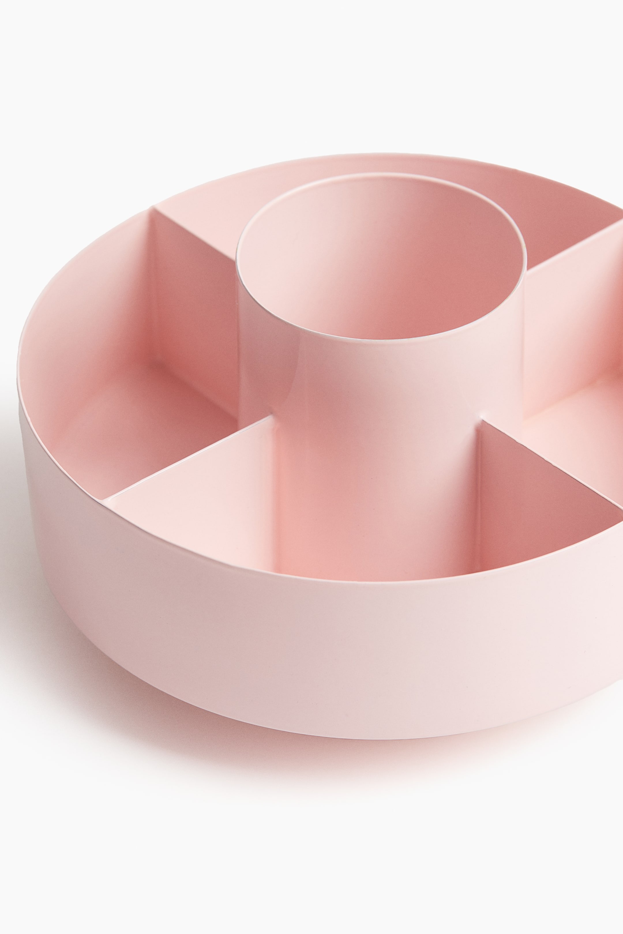 Круглый металлический контейнер с пятью отделениями. Идеально подходит для хранения косметики, канцелярских принадлежностей и других мелких предметов. Вращающаяся конструкция обеспечивает лёгкий доступ к хранящимся предметам, а силиконовое покрытие на дне защищает поверхность, на которой стоит контейнер.