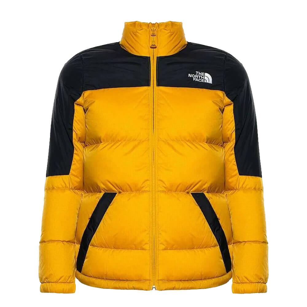 Пуховик от The North Face желтого цвета с черными вставками на плечах, рукавах и карманах. Белый логотип на груди и спине. Передние карманы, внутренний карман. Воротник на подкладке, застежка-молния.