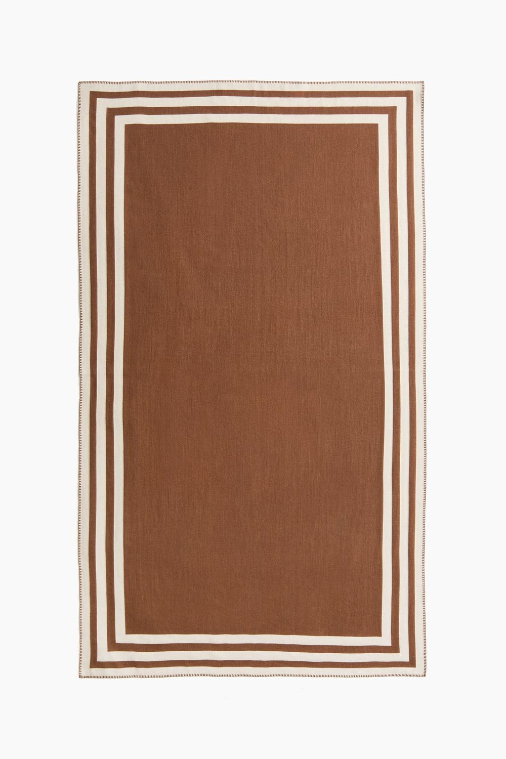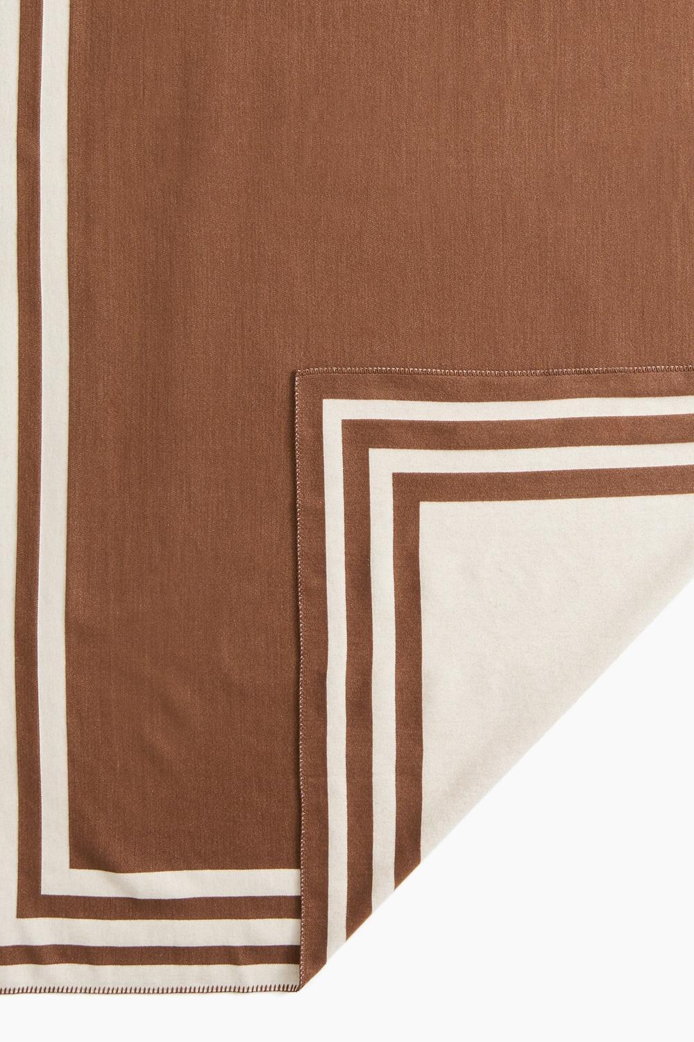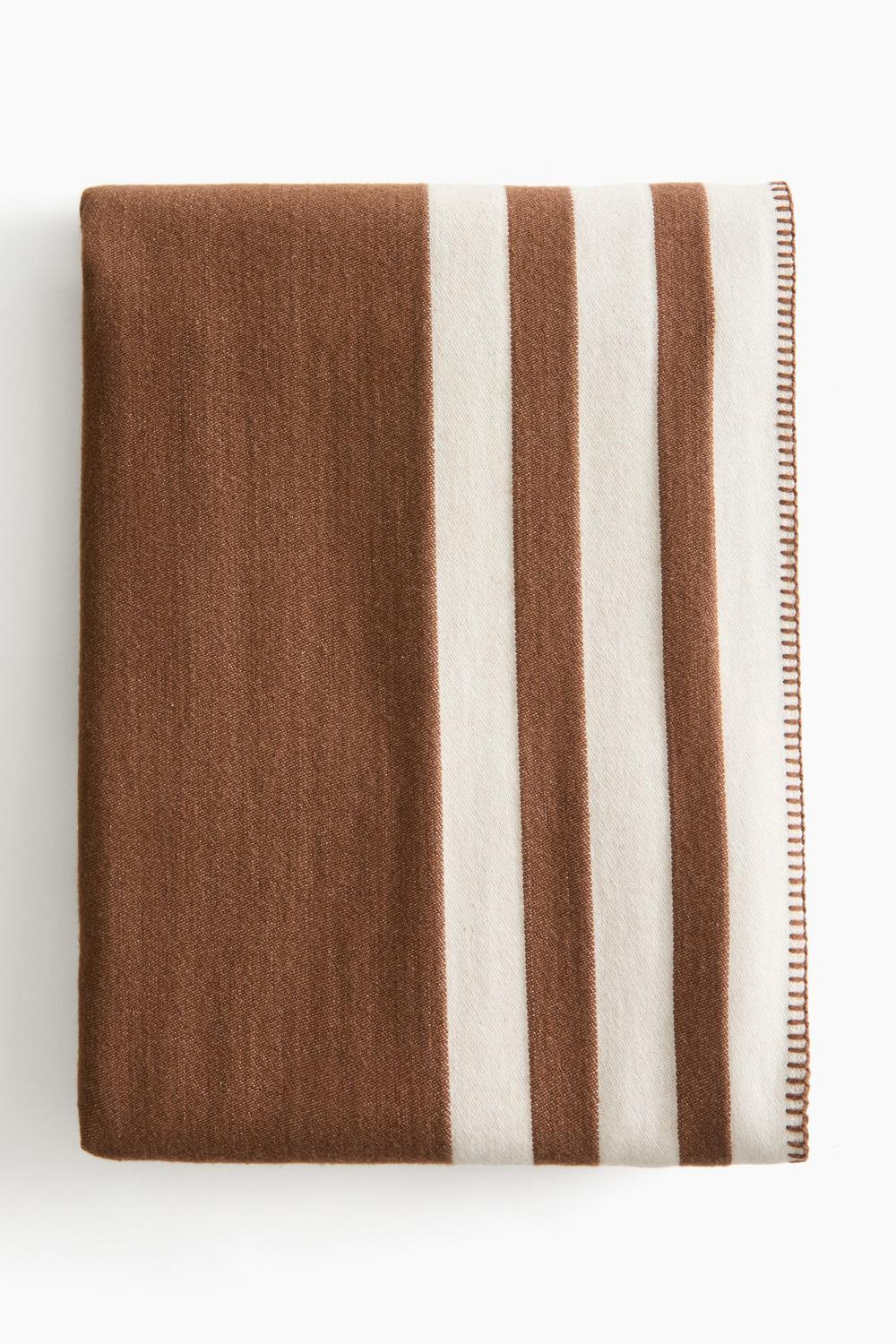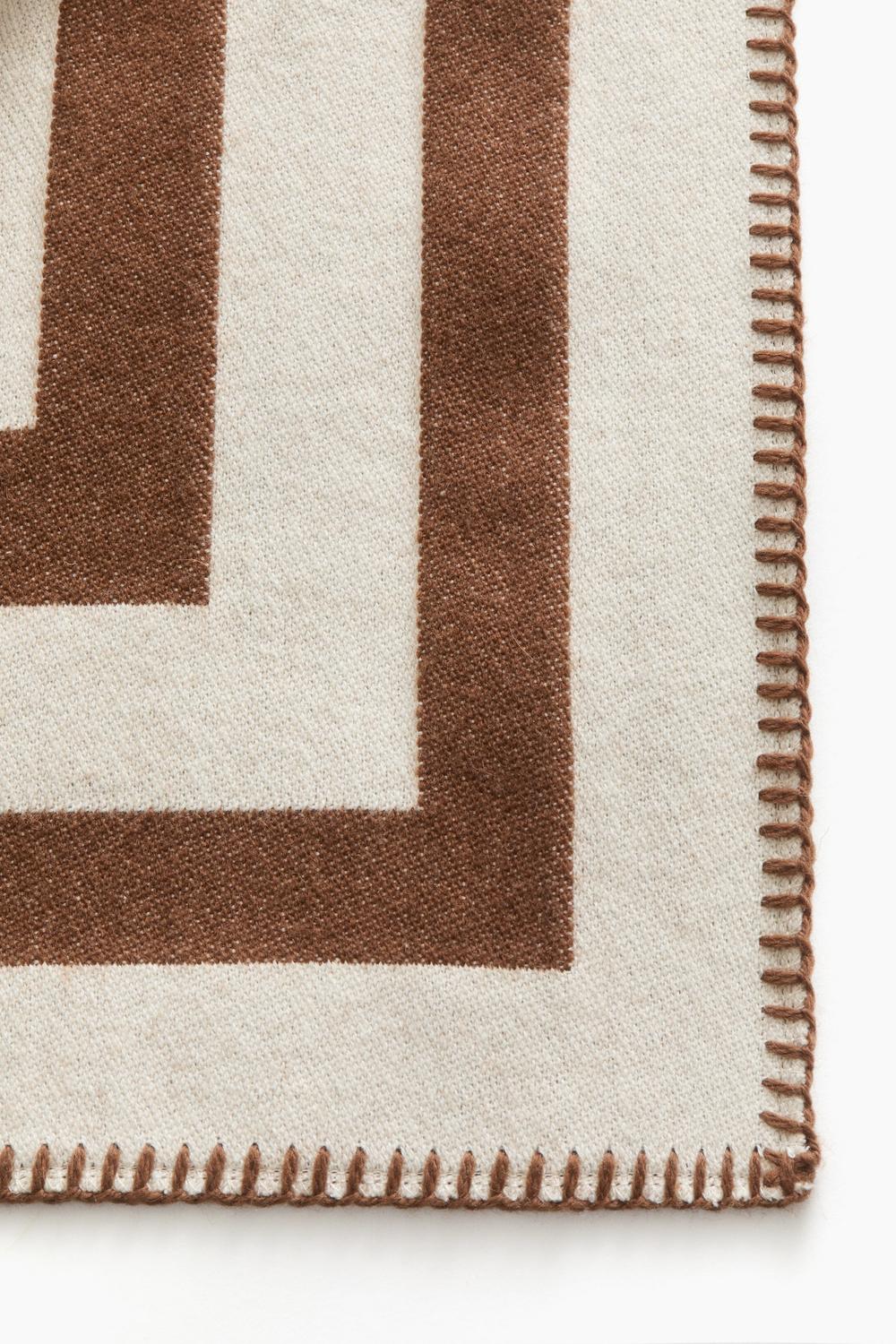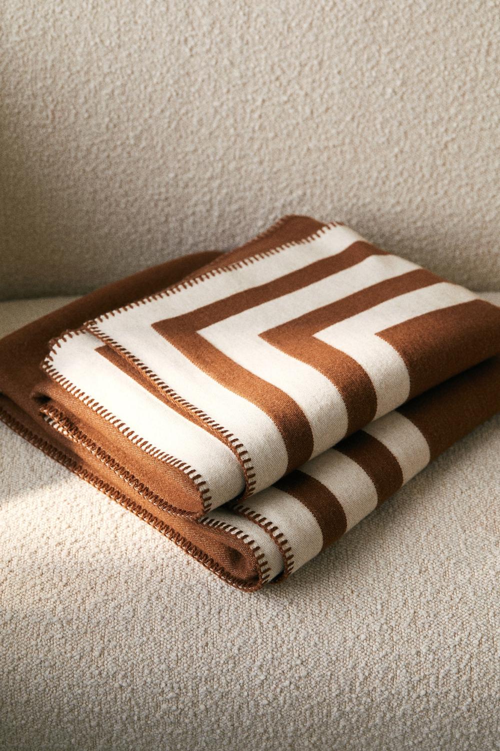 Плед жаккардового переплетения из смеси хлопка и шерсти. Полосатая кайма и трикотажная отделка по краям.