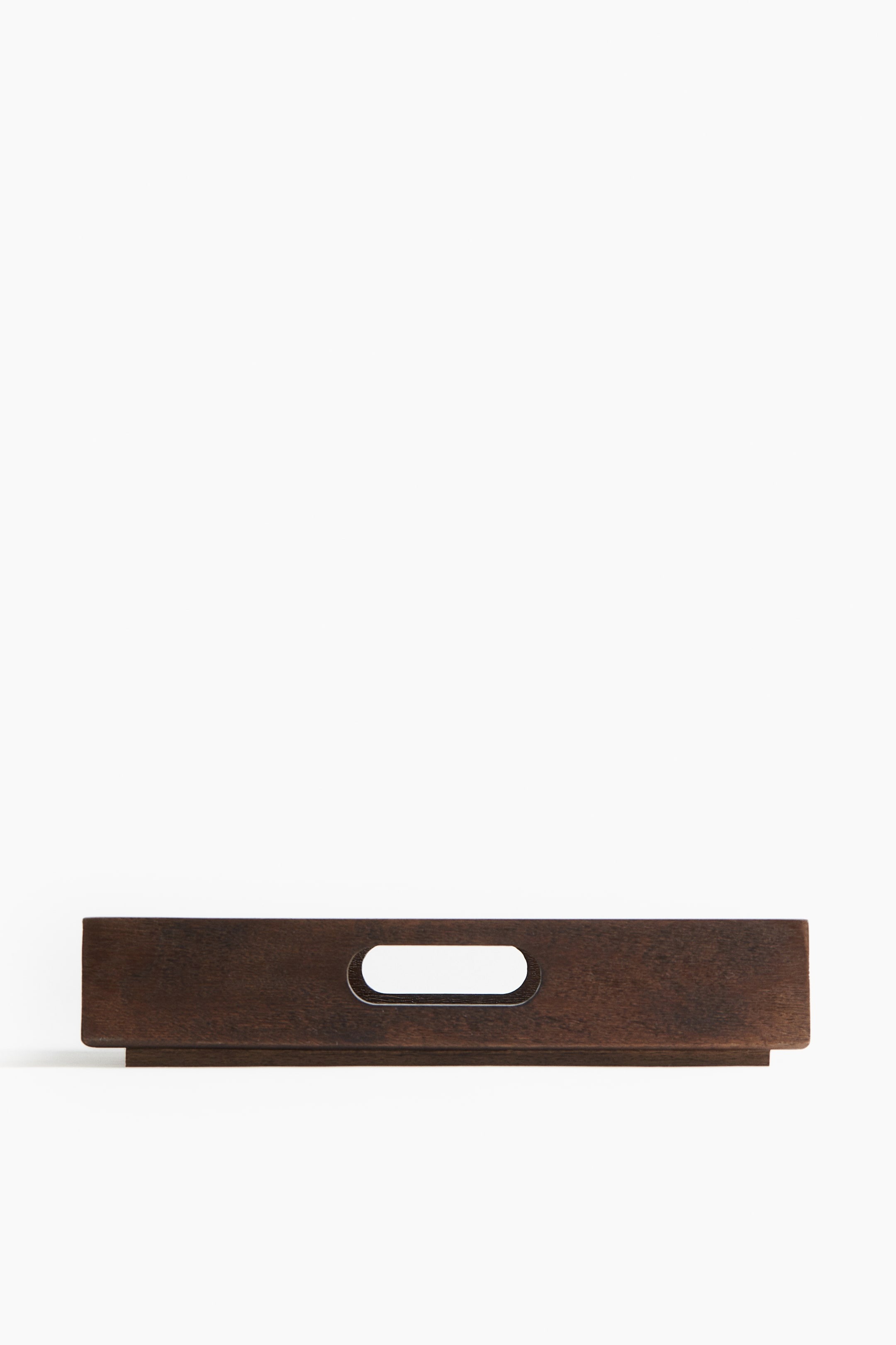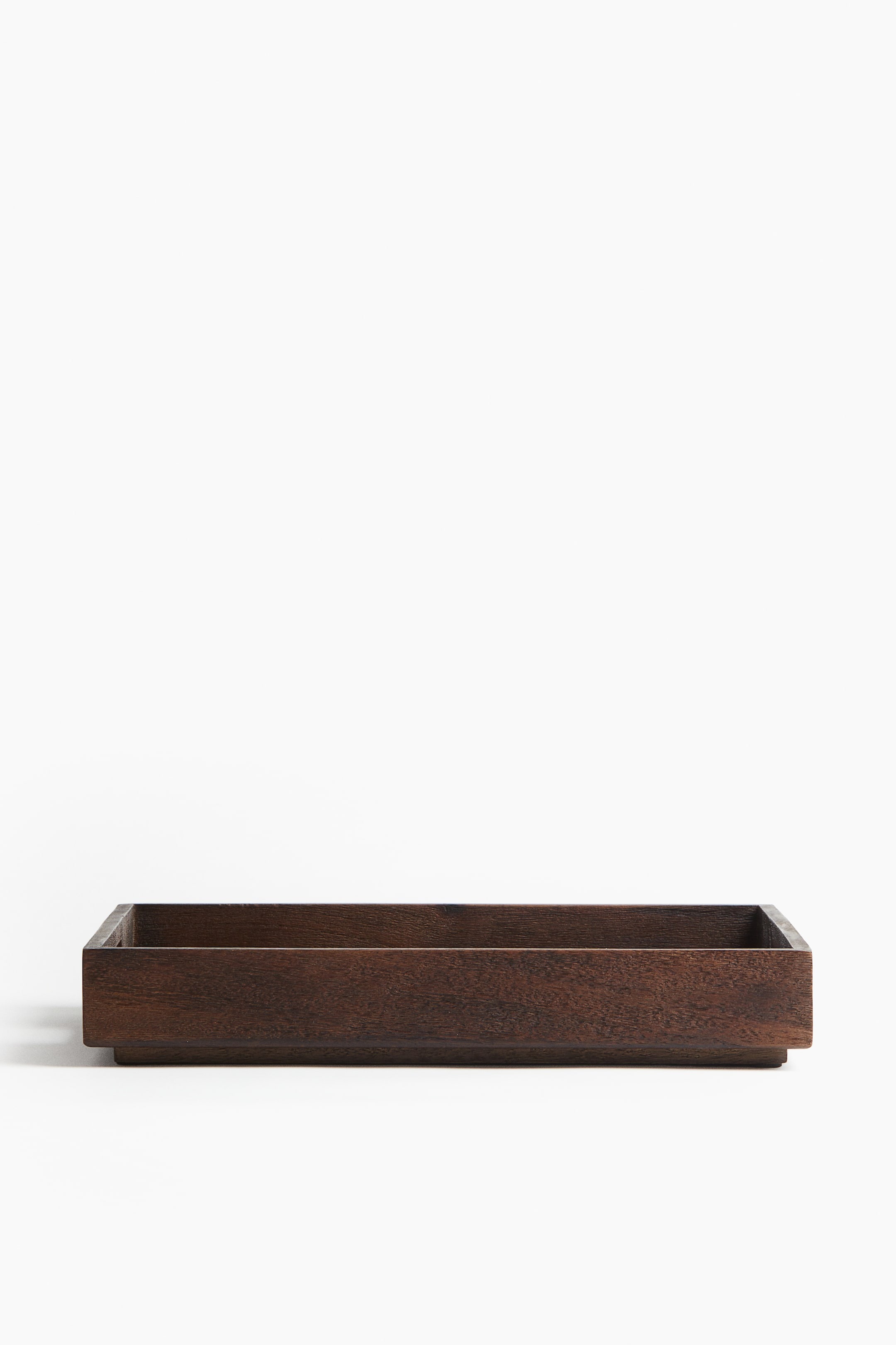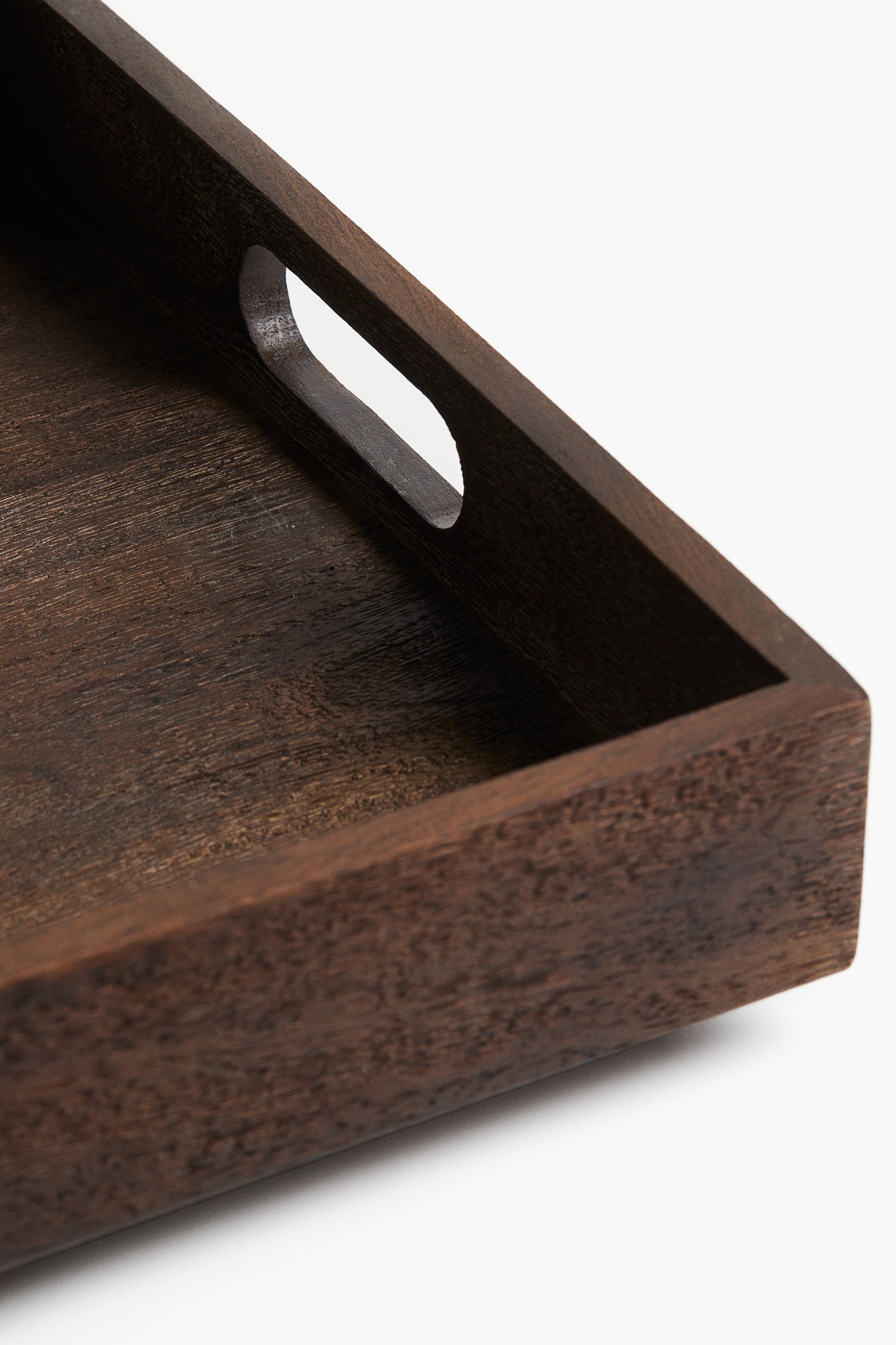 Прямоугольный поднос из мангового дерева с приподнятым краем. Подносы легко штабелируются и хранятся, когда не используются.