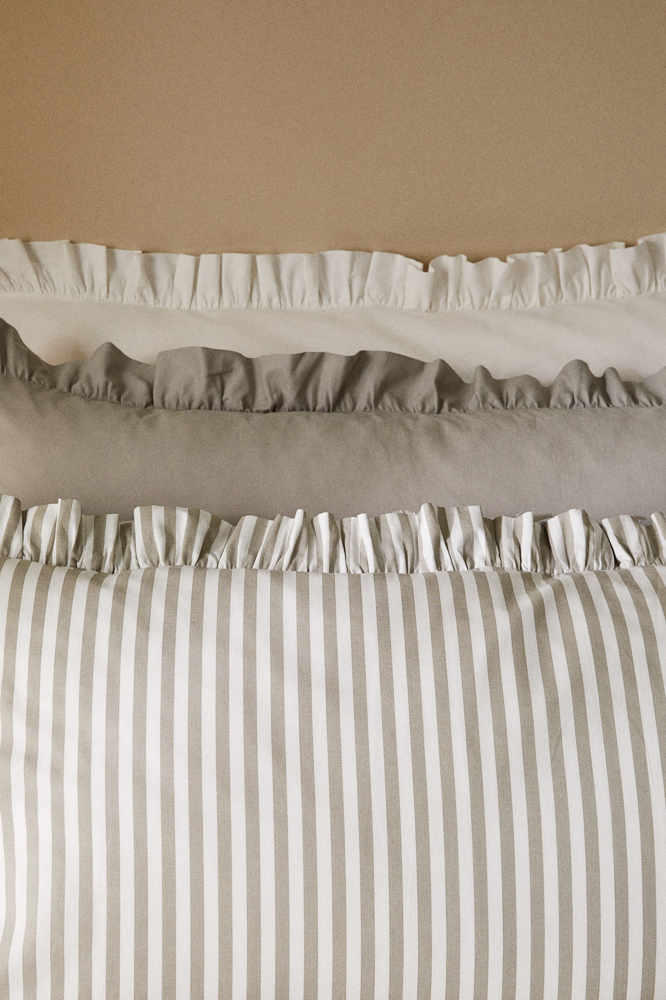Наволочка изготовлена из хлопковой ткани с оборкой по краям. Застёжка-молния сбоку.