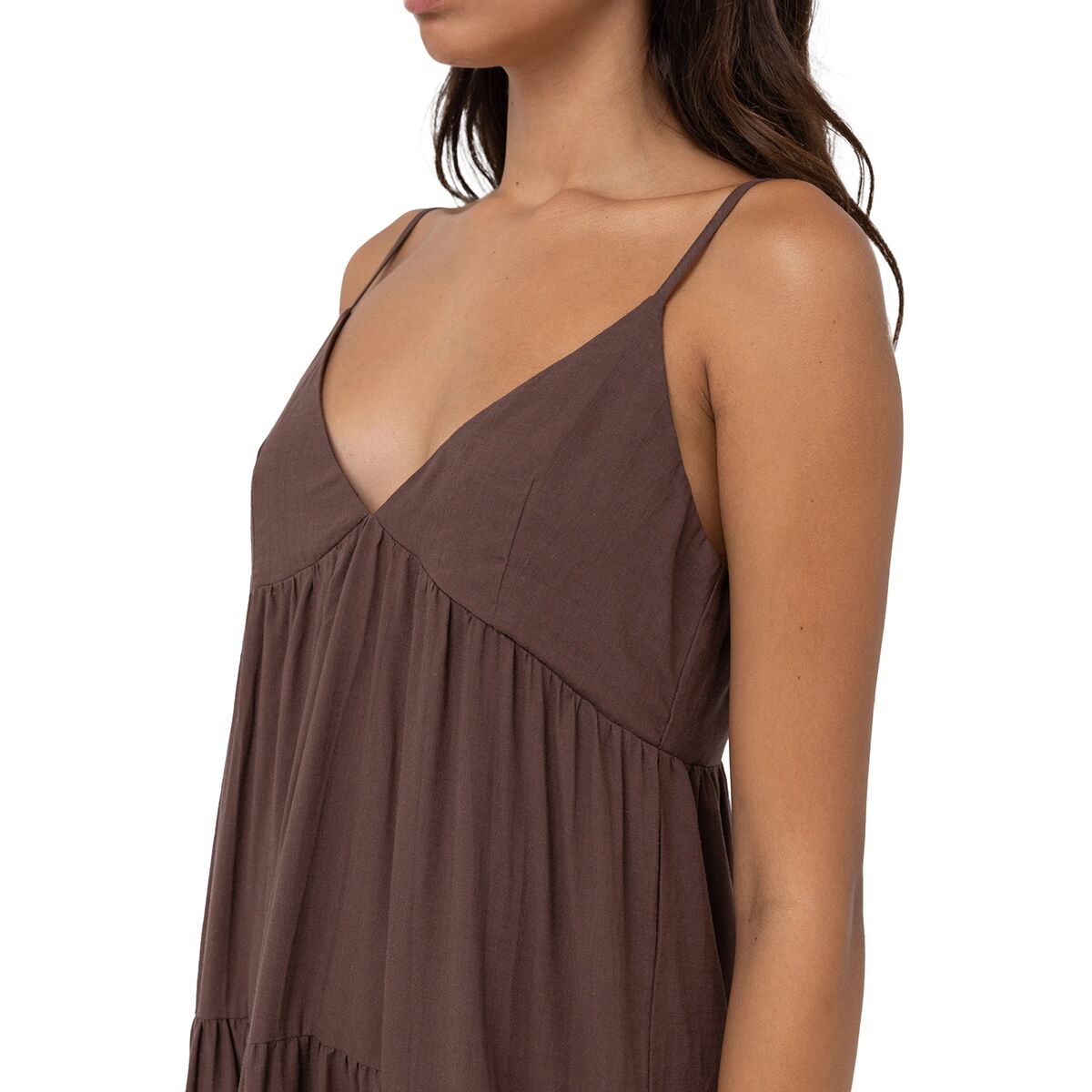 Многоуровневое платье миди Rhythm Classic в шоколадном цвете — потрясающее изделие, сочетающее в себе изысканность и прибрежный шарм. Благодаря приталенному лифу, глубокому V-образному вырезу и многоуровневому подолу, это платье создает изящный силуэт, идеально подходящий для самых разных случаев.