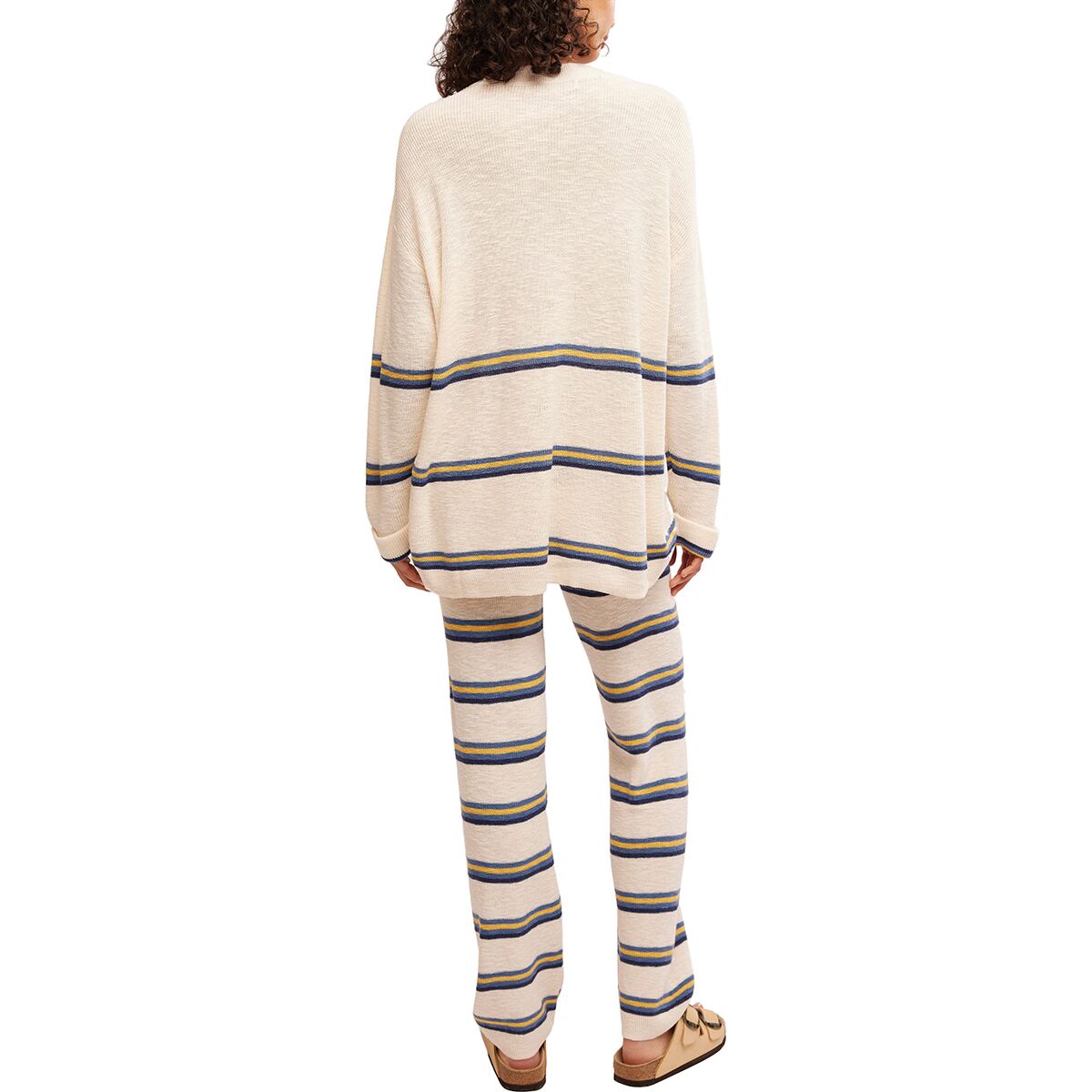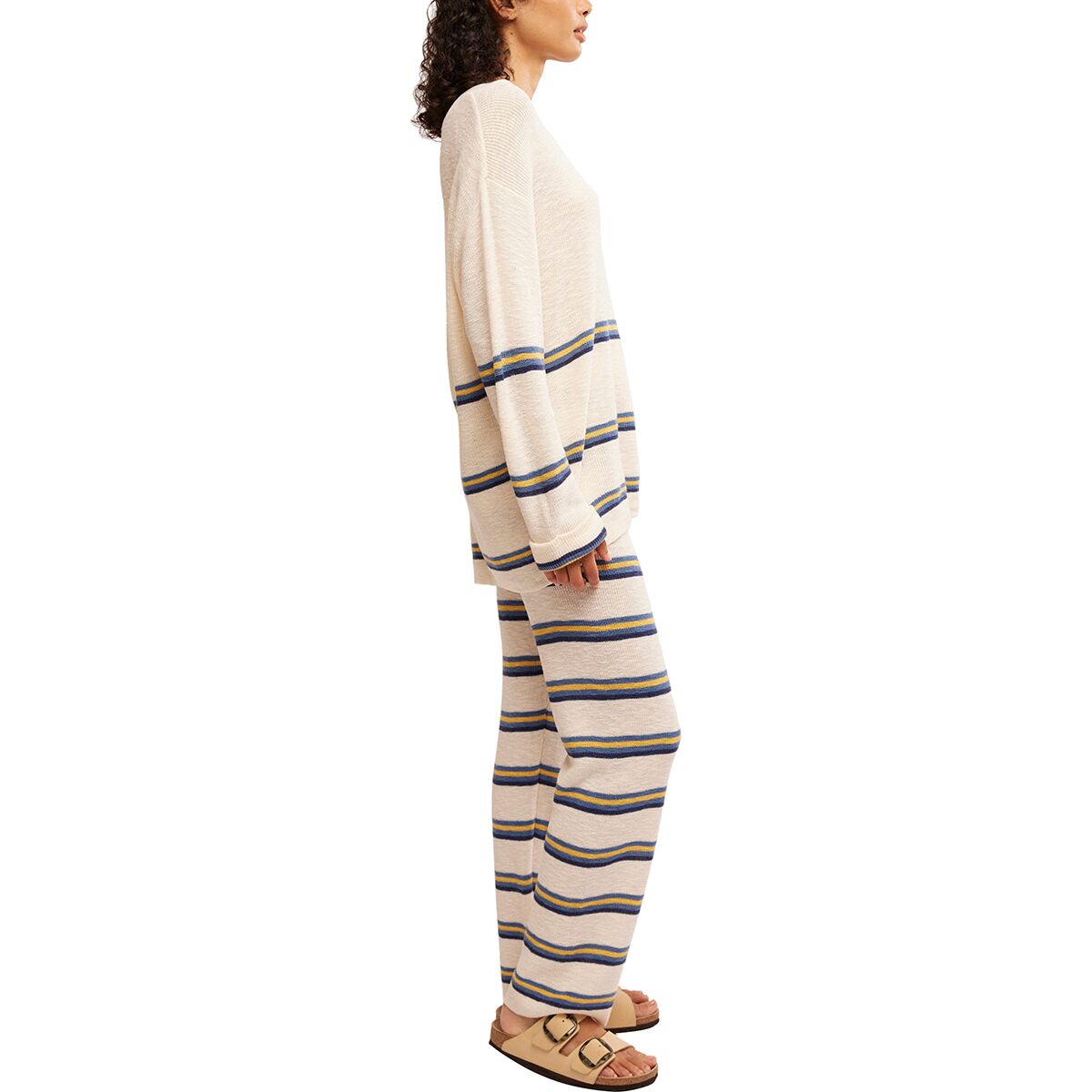 Свободный топ с круглым вырезом и свободные брюки широкого кроя легко комбинируются друг с другом и обеспечивают комфорт в течение всего дня. Продуманные детали, такие как спущенные плечи, ребристые края и пояс на шнурке, делают этот комплект не просто базовым. Разноцветные полосы придают морское очарование, а карманы добавляют практичности и функциональности. Независимо от того, носите ли вы их вместе или по отдельности, Mariner обеспечивает сезонную универсальность благодаря средней плотности трикотажа, который всегда готов к тому, что принесет день.