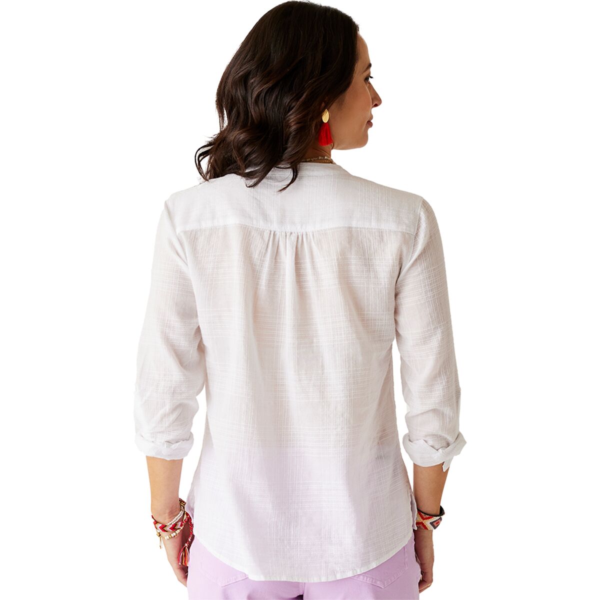 «Эта рубашка идеально подходит для тёплых дней, когда вам нужна универсальная вещь. Легкая и дышащая текстура марли делает её идеальным выбором для тропического отпуска или солнечных прогулок. Мне нравится, как она отлично сочетается как с шортами для повседневных дней, так и с джинсами для создания нарядного образа».