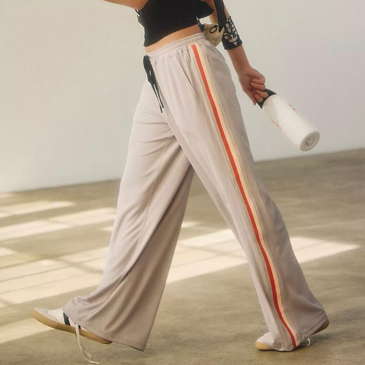 «Эти брюки — идеальное сочетание спортивного и стильного. Мягкая сетчатая ткань дышащая и удобная, поэтому их можно надевать поверх спортивной одежды или просто отдыхать. Мне нравится широкий крой и ретро-полоски по бокам — они добавляют весёлый, ретро-образ. Затягивающийся шнурок на талии надёжно фиксирует их, независимо от того, разминаюсь ли я в студии или бегаю по делам».