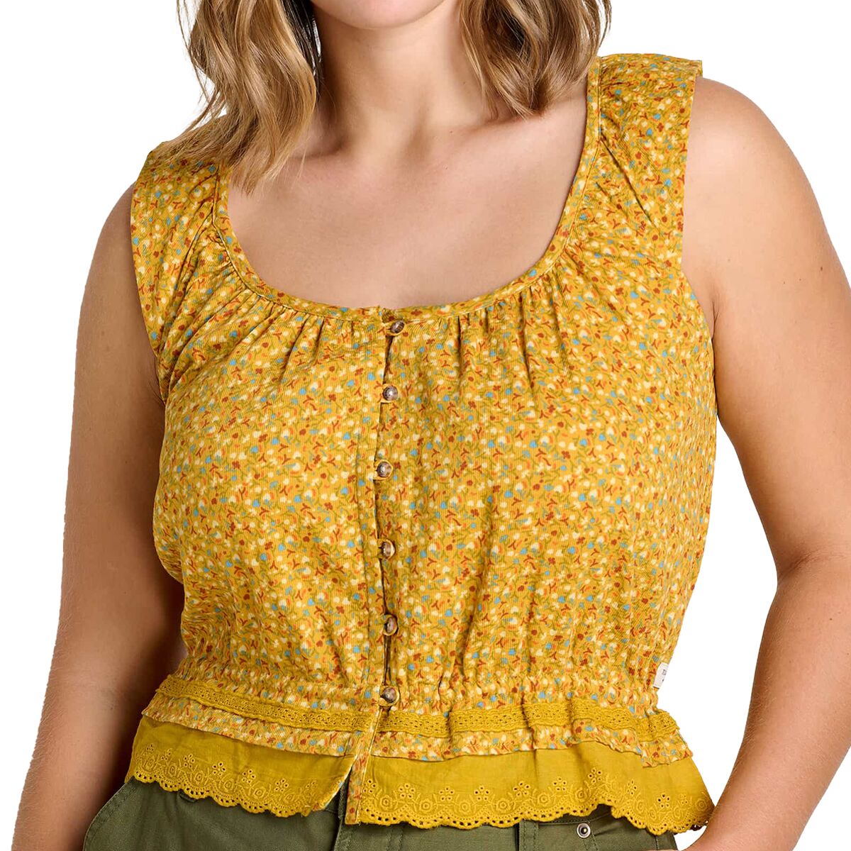 Майка Toad&Co Manzana Ruffle сочетает в себе непринужденный комфорт и игривый стиль. Она застегивается на пуговицы, украшена изящными оборками по подолу и имеет округлый вырез горловины. Изготовленная из органического хлопка, она приятна на ощупь и экологична, что является дополнительным преимуществом.
