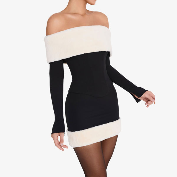 Облегающий крой, средняя посадка, отделка из искусственного меха по подолу, длина мини