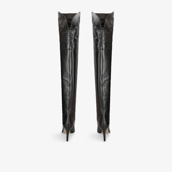Закрытый острый носок, выше колена, завязки сзади, анатомический каблук