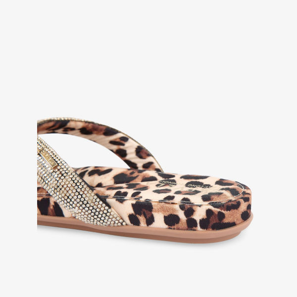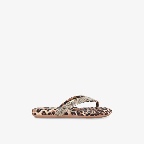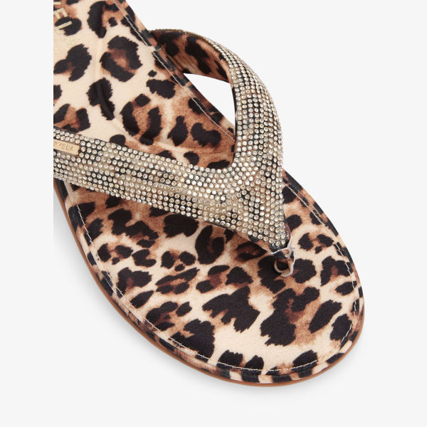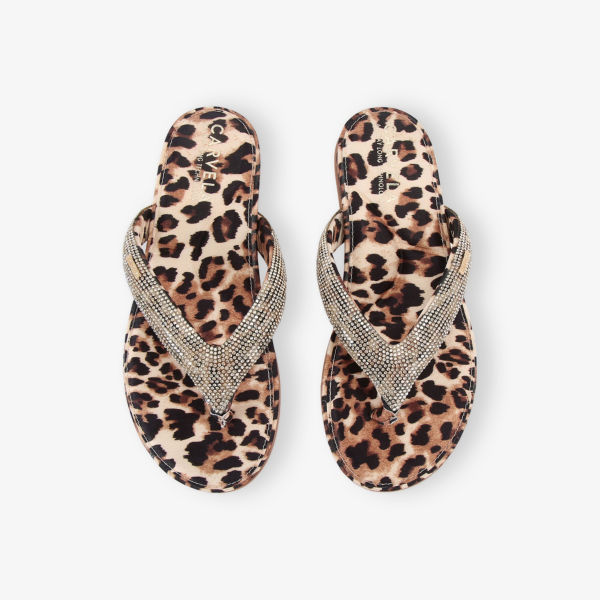 Открытый круглый носок, перекладина для пальцев, леопардовый принт по всей поверхности, атласная текстура, ремешок с кристаллами, золотистая фирменная фурнитура на ремешке, мягкая стелька, плоская подошва