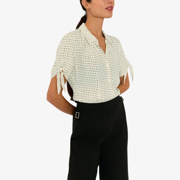 Классический крой, отложной воротник, короткие рукава, завязывающиеся манжеты, узор в горошек по всей поверхности