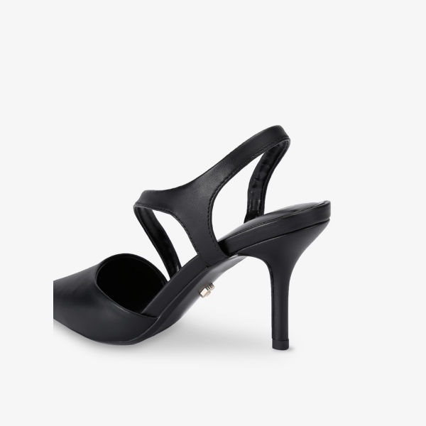 Закрытый заостренный носок, ремешок на щиколотке, металлическая заклепка в виде буквы «С» на подошве, высокая шпилька