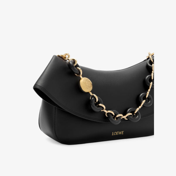 Изогнутый корпус, клапан спереди, съемный трубчатый кожаный ремень, съемная цепочка-пончик, одно основное отделение, один внутренний карман, тисненая золотистая надпись LOEWE, гравировка Anagram
