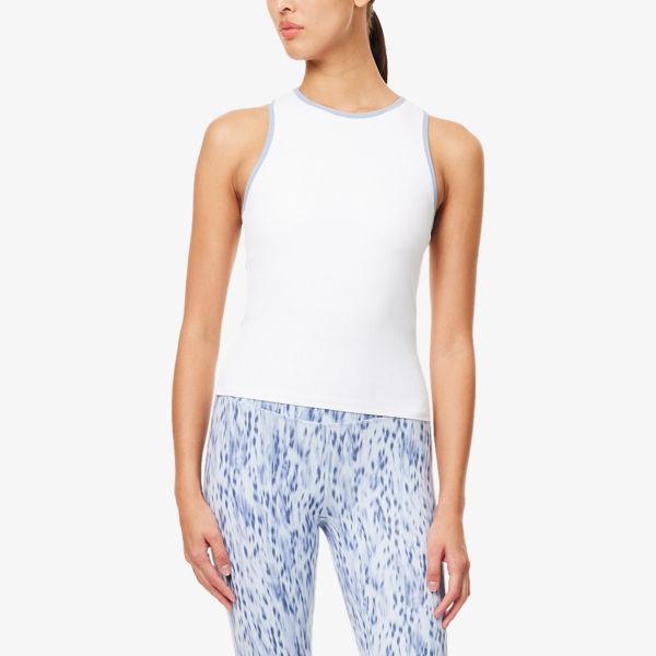 Облегающий крой, круглый вырез, без рукавов, спинка-борцовка, ребристые детали по всей поверхности, контрастная отделка, внутренняя полочка со съемными чашечками, прямой подол