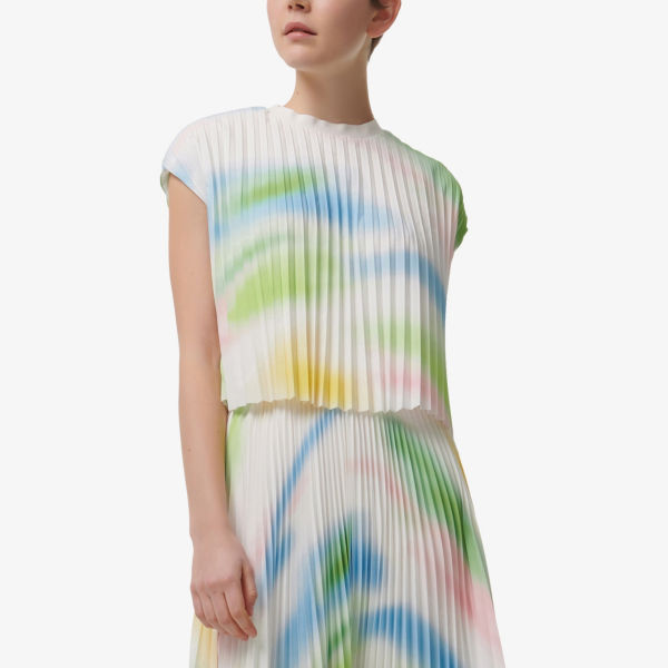 Классический крой, круглый вырез, короткие рукава, абстрактный принт, плиссированная текстура