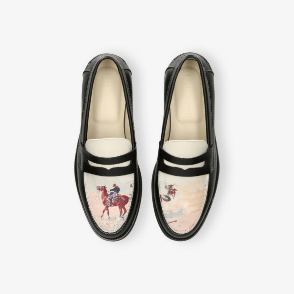 Закрытый миндалевидный носок, принт «Воин», монохромный дизайн, контрастная строчка, отделка в виде пенни спереди, наборный каблук