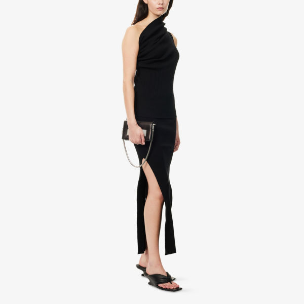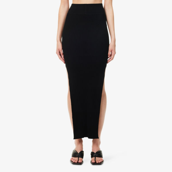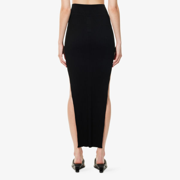 Облегающий крой, высокая талия, эластичный пояс, разрезы по бокам, трикотажная ткань с резинкой по всей поверхности