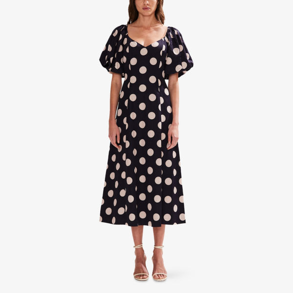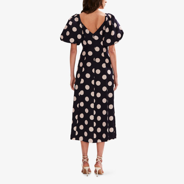 V-образный вырез, короткие рукава-фонарики, боковые карманы, расклешённая юбка, сплошной принт в горошек
