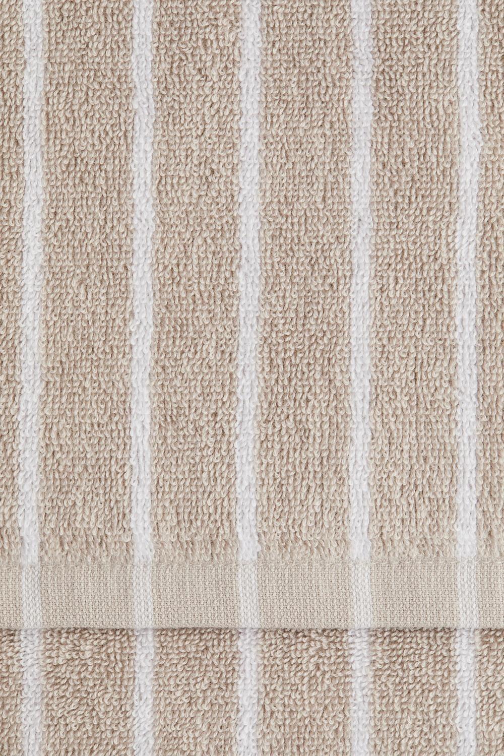 Это банное полотенце изготовлено из мягкой, хорошо впитывающей хлопковой махровой ткани. Благодаря полоскам, окрашенным в пряже, его можно легко сочетать с однотонными полотенцами, создавая современный и элегантный образ ванной комнаты. Полотенце также оснащено петлей для подвешивания. Плотность полотенца: 480 г/м².