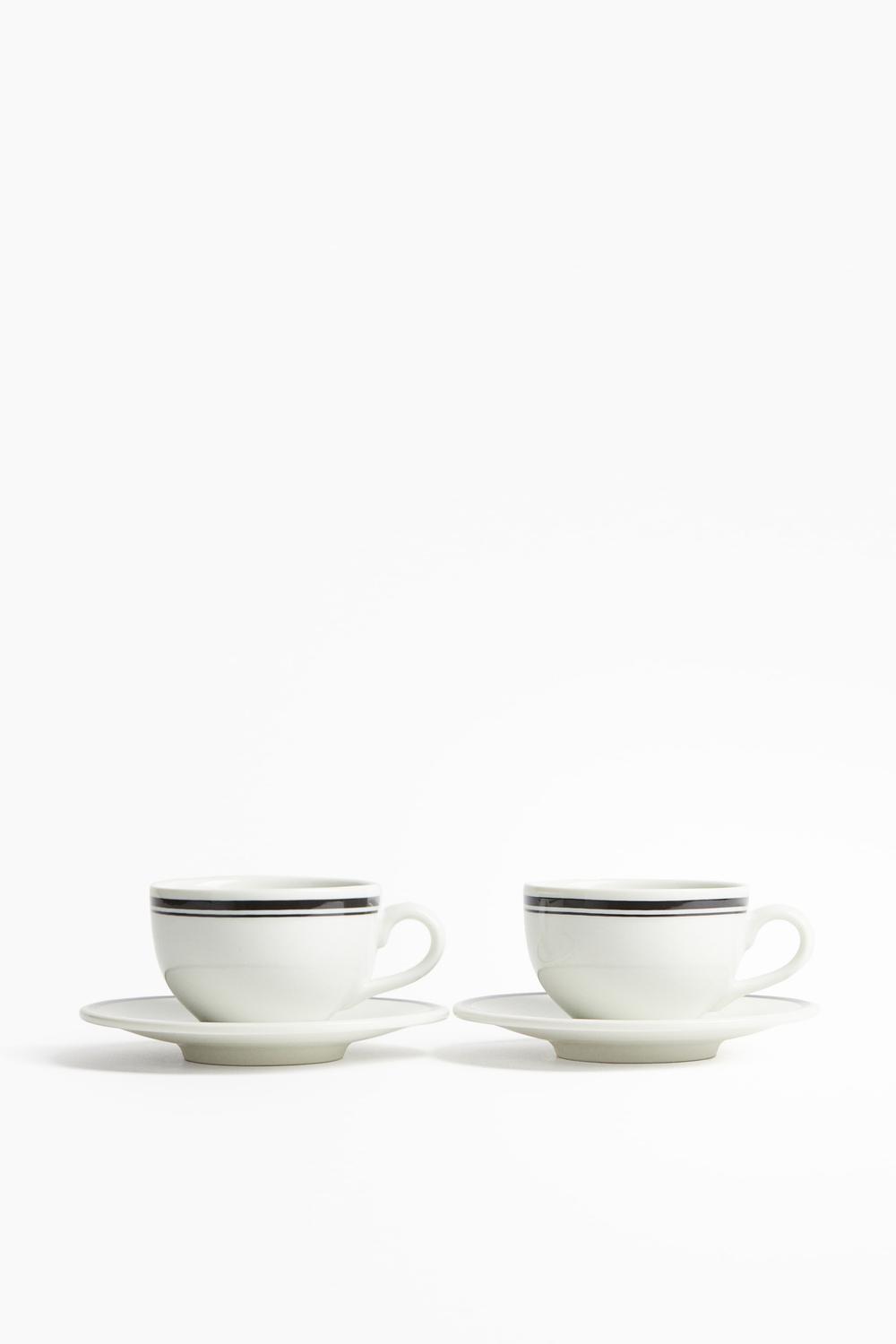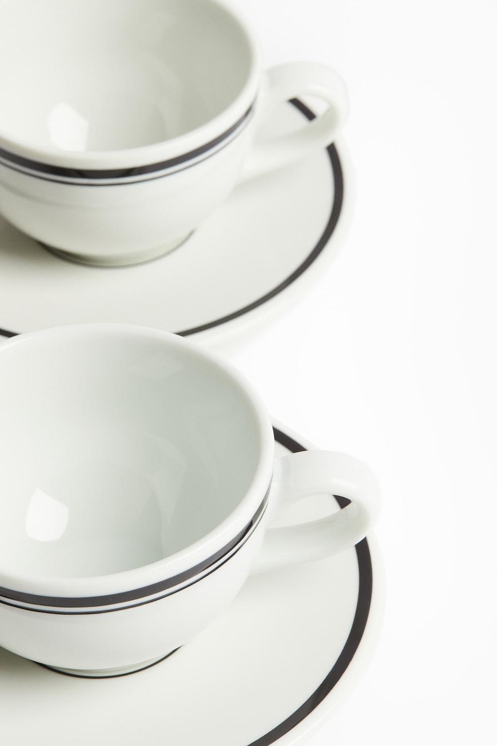 Две фарфоровые чашки для капучино с блюдцами, украшенные классическим расписным бортиком и вдохновлённые уютными французскими бистро.
