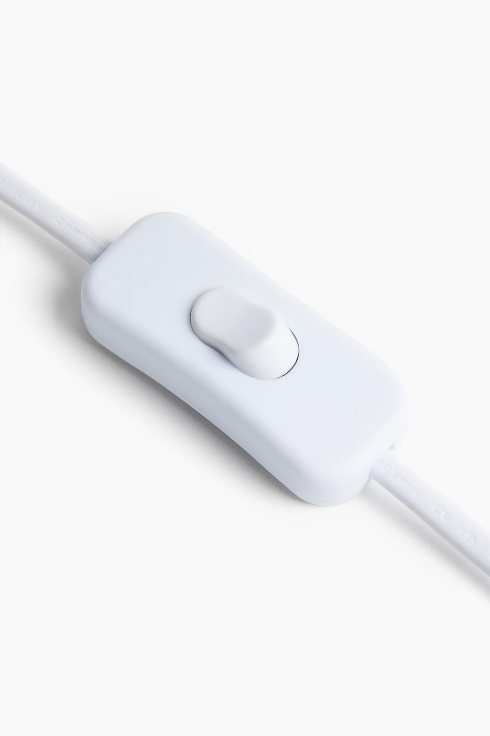 Небольшая настольная лампа из узорчатой ткани, напоминающей лён, на проволочном каркасе, излучает приятный свет. Шнур с пластиковым выключателем.