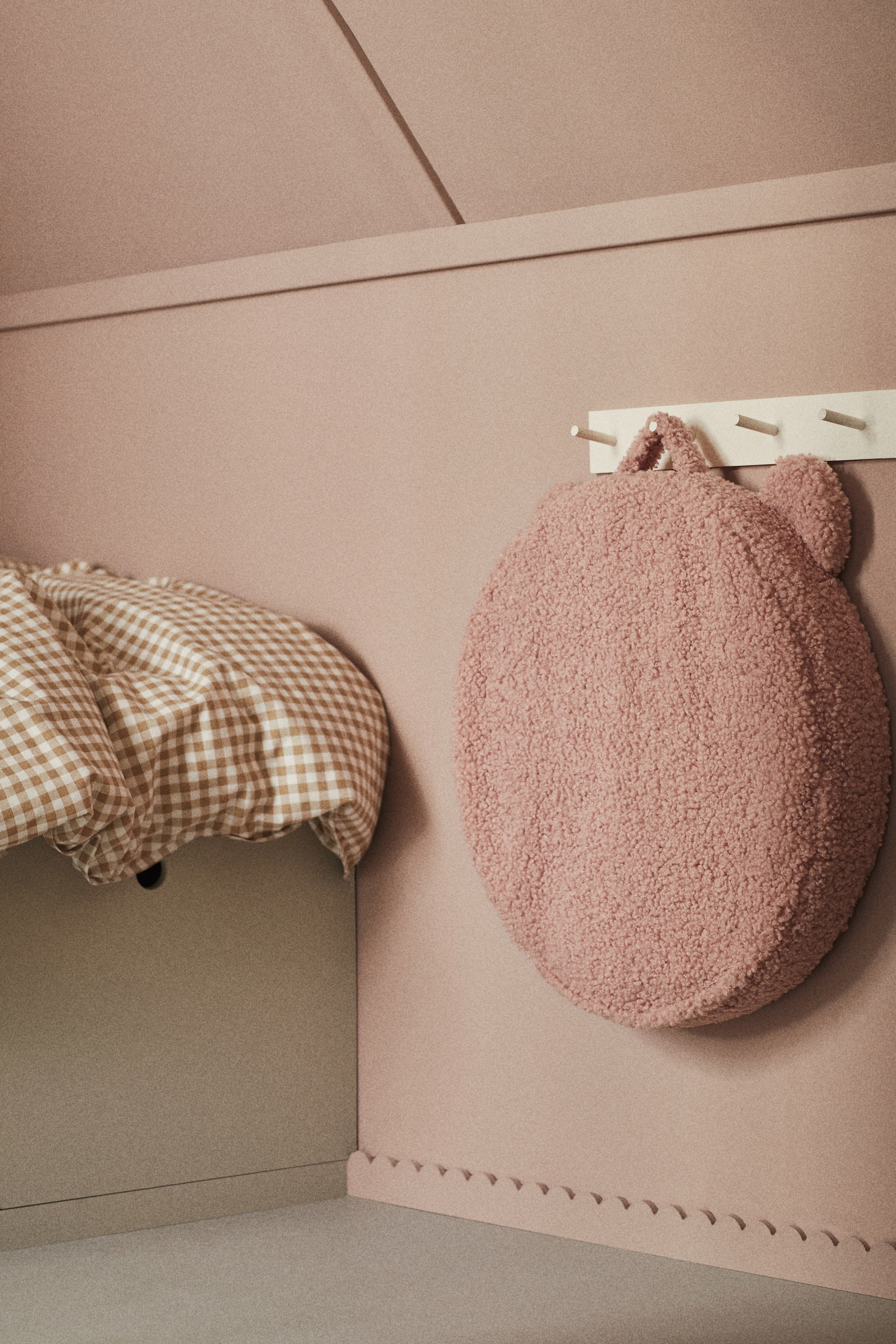 Очаровательная круглая мягкая напольная подушка в виде плюшевого мишки с ручкой и аппликацией в виде ушка. Положите её на пол, чтобы удобно сидеть во время игры, или создайте уютный уголок в детской комнате.